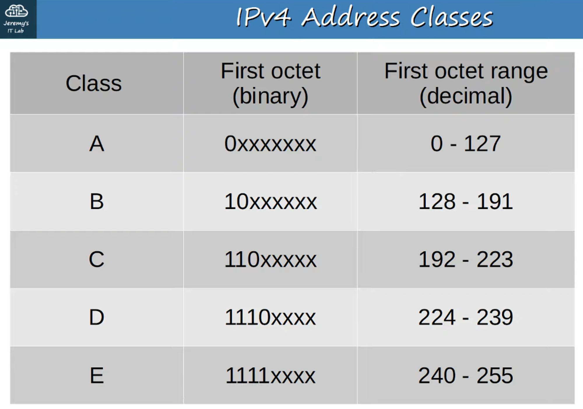 In IPv4, addresses are categorized into classes, but only Class A, B, and C addresses can be assigned to devices as IP addresses: