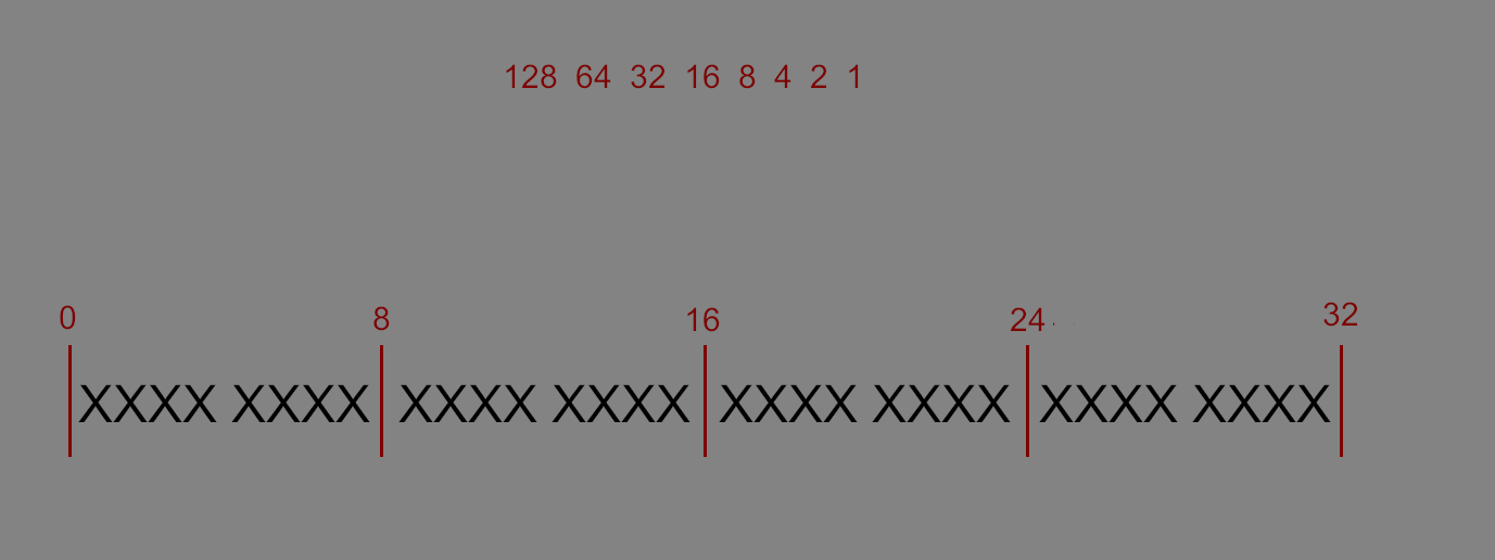 | Subnet Mask | 128 | 192 | 224 | 240 | 248 | 252 | 254 | 255 |