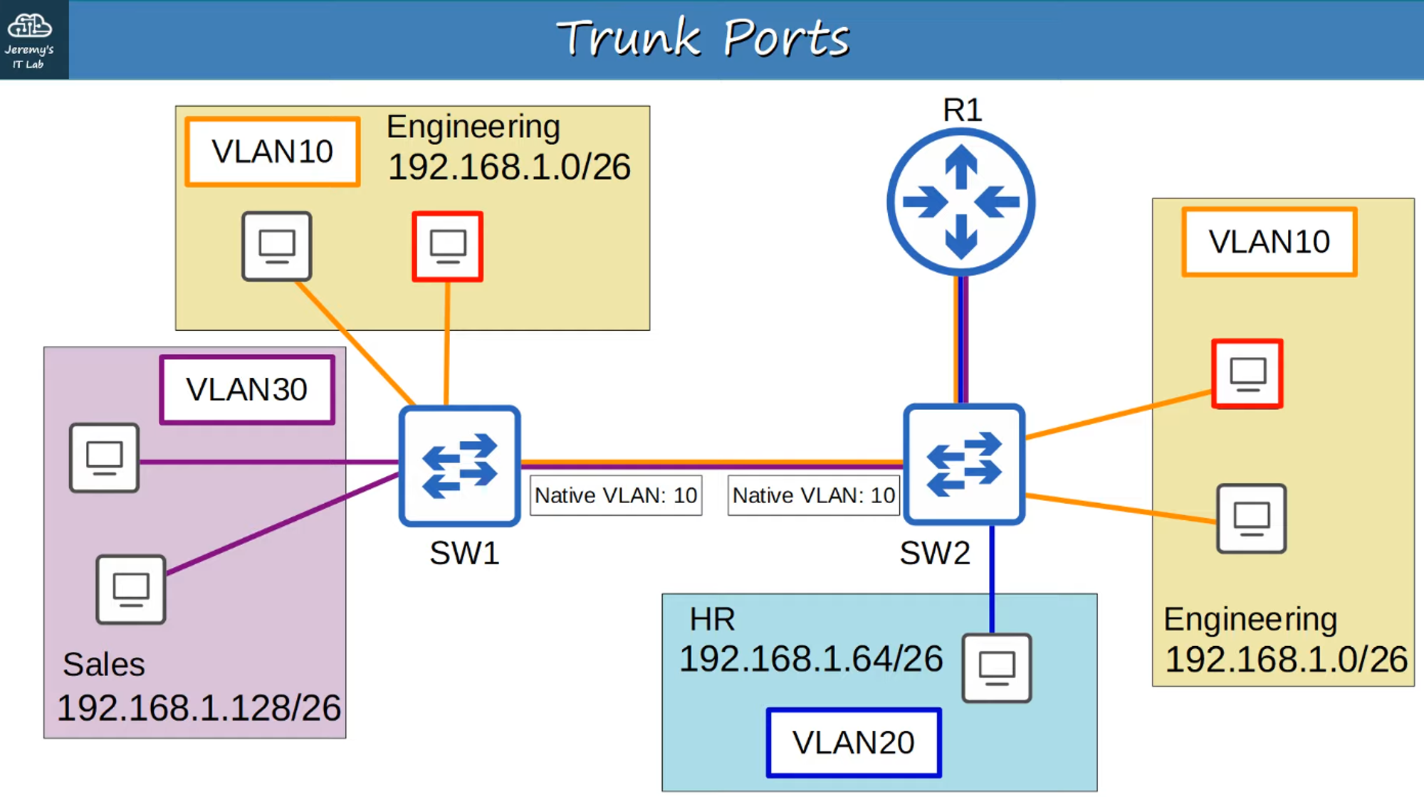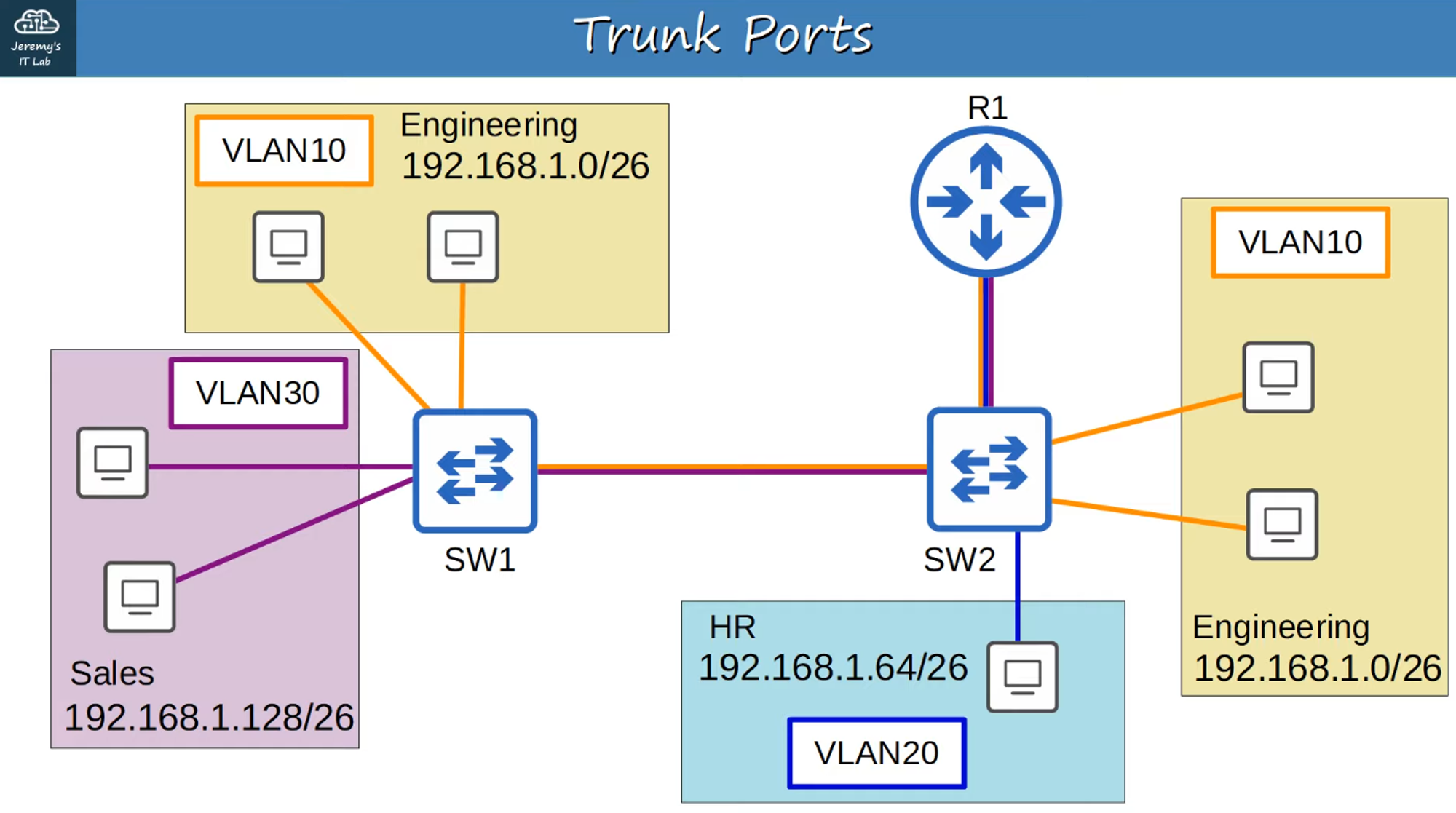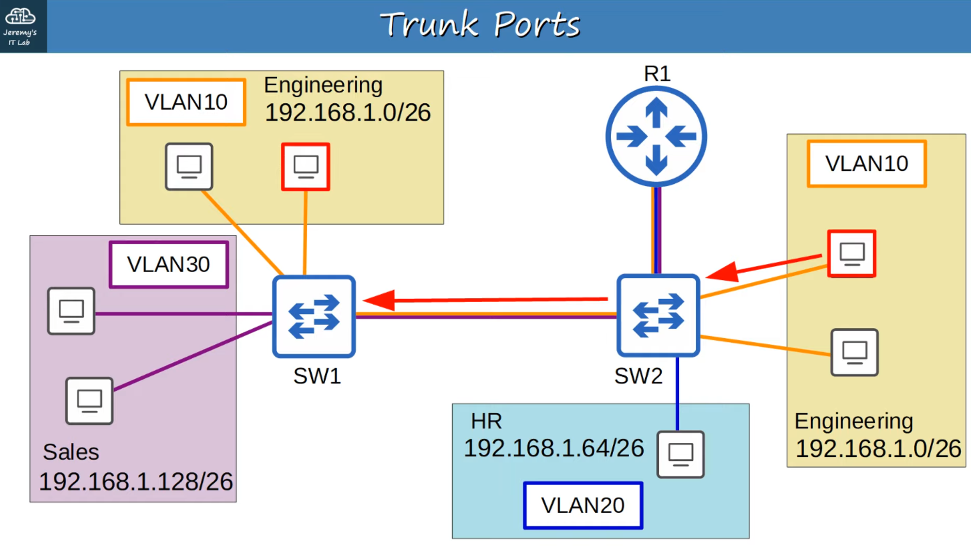 In this setup, we have two switches (SW1 and SW2), with the Engineering department (VLAN 10) located at two different network locations.