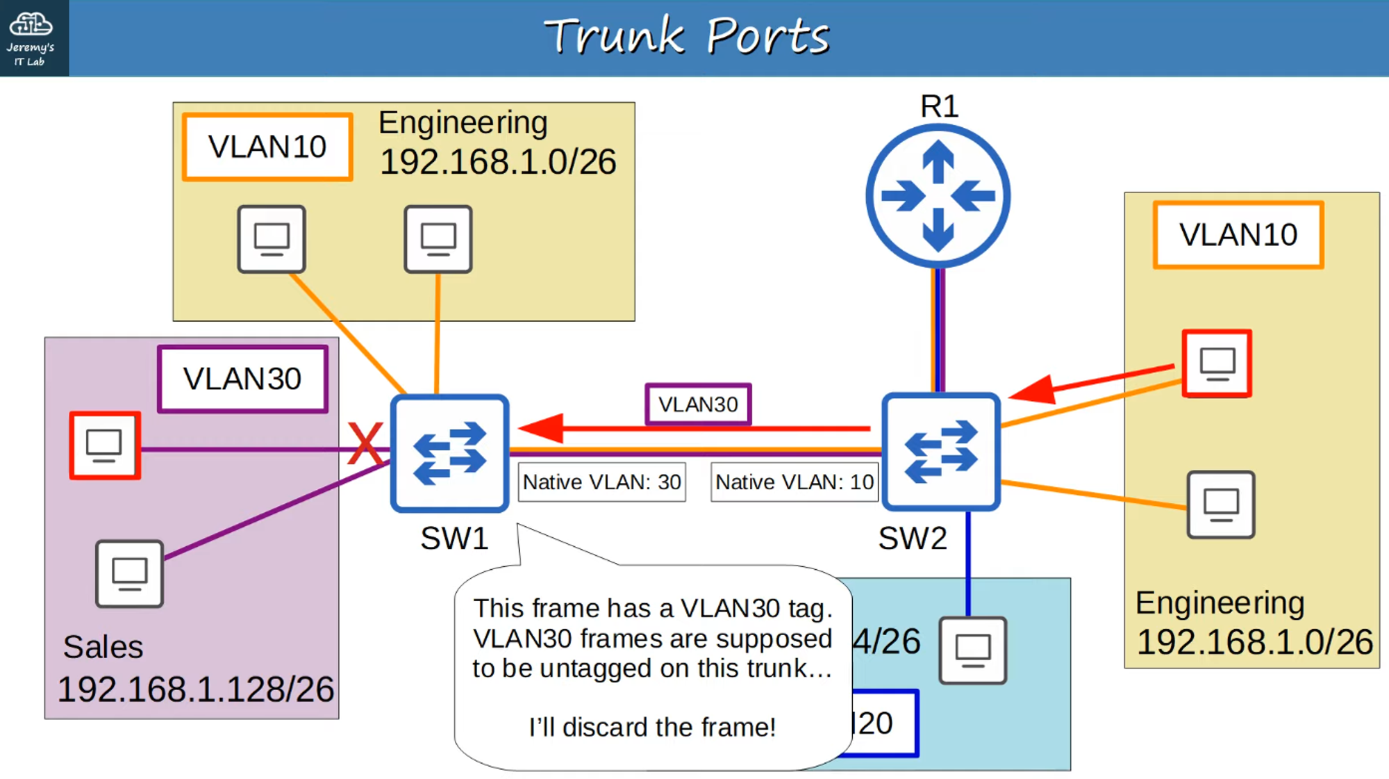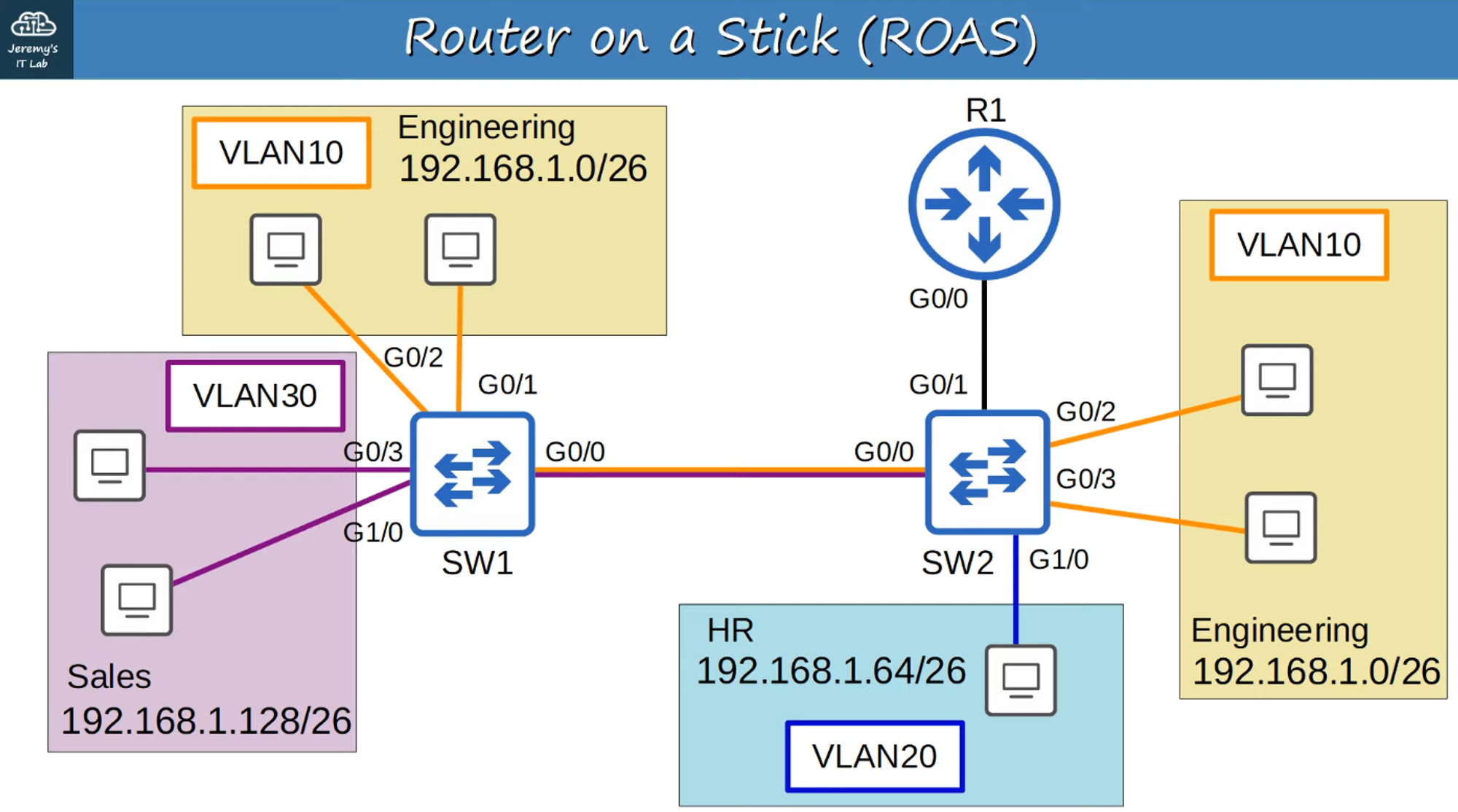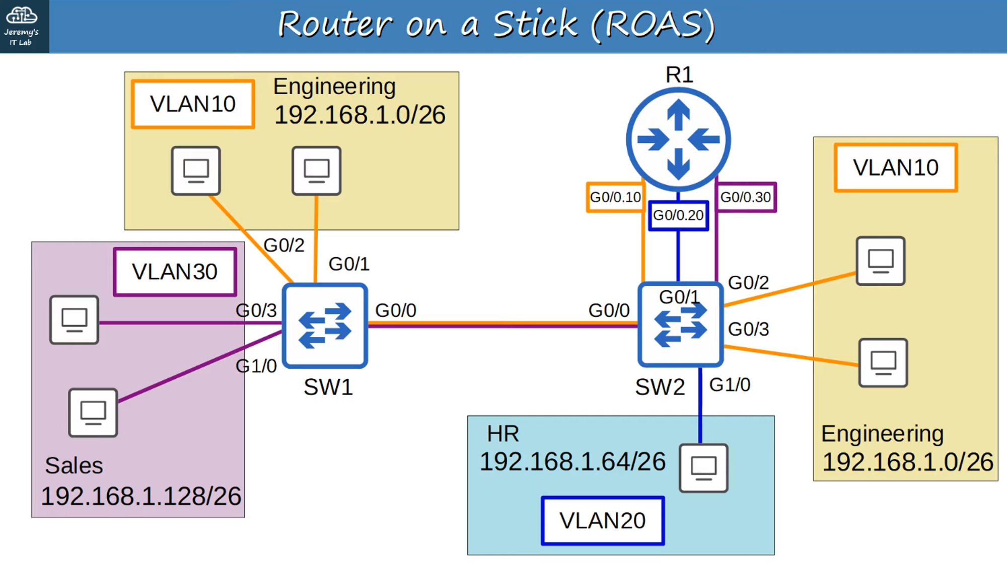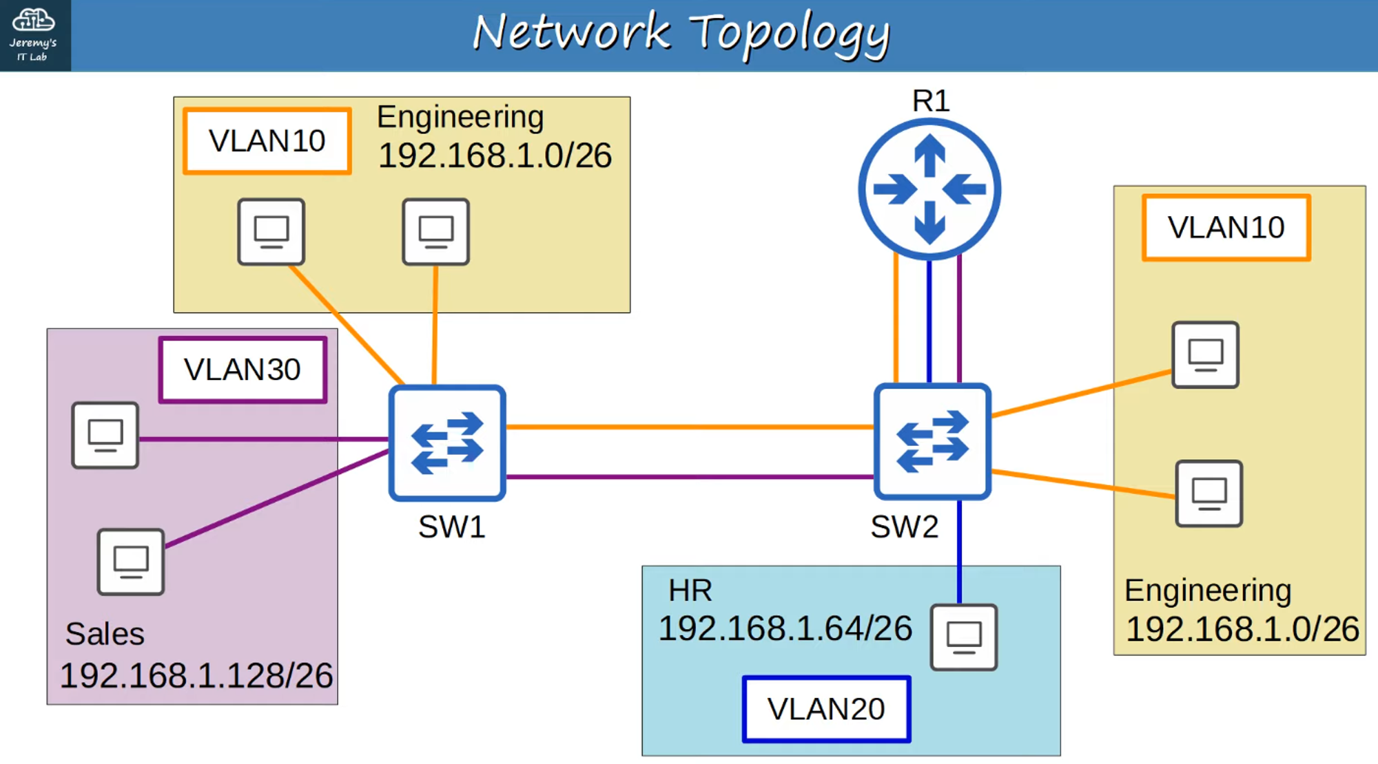 In this setup, we have two switches (SW1 and SW2), with the Engineering department (VLAN 10) located at two different network locations.