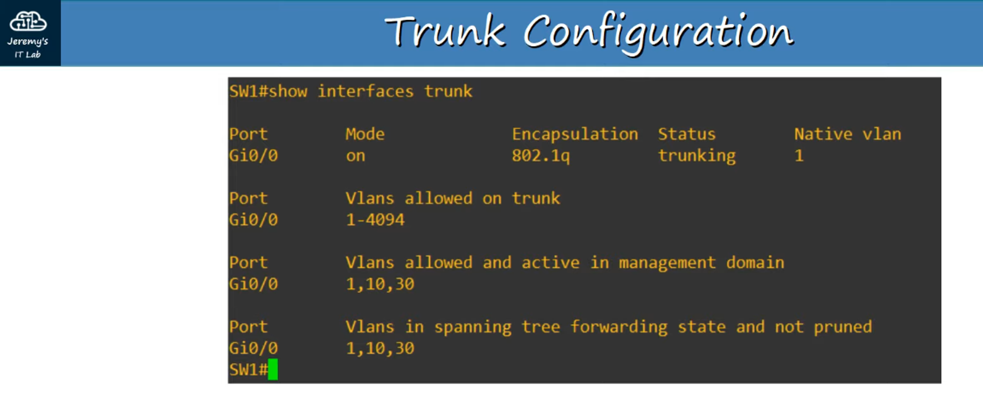 - Trunk Configuration: The switch interface connected to the router is configured as a trunk port.