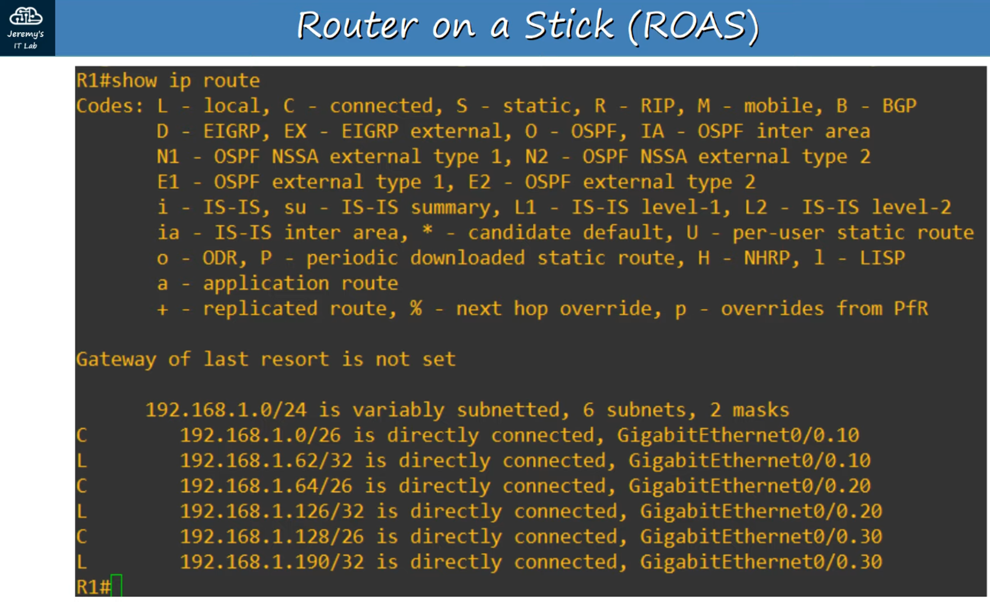 - Show IP Route: Sub-interfaces will also appear in the router’s route table.