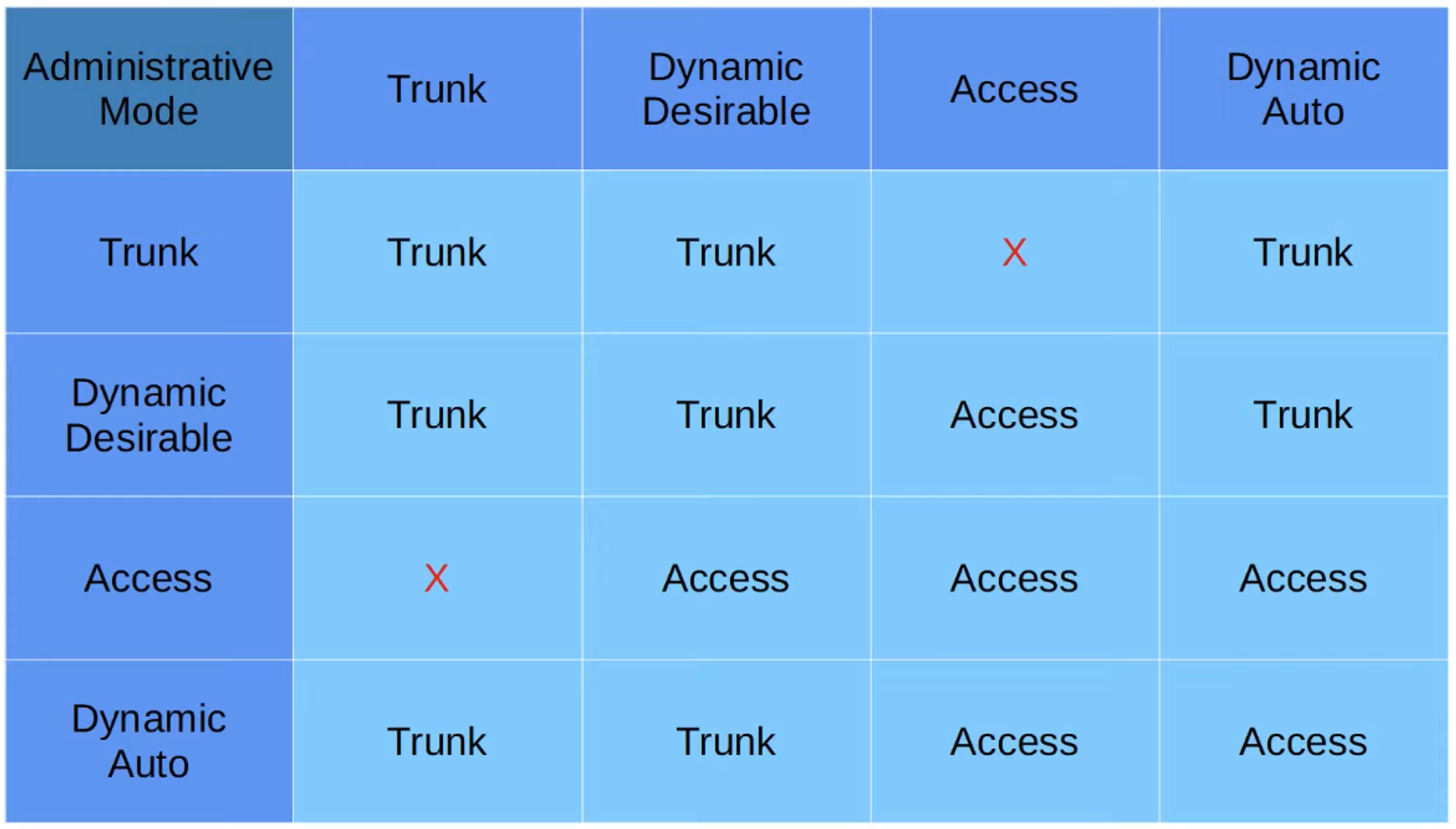 - Forms a trunk with a switchport in these modes: