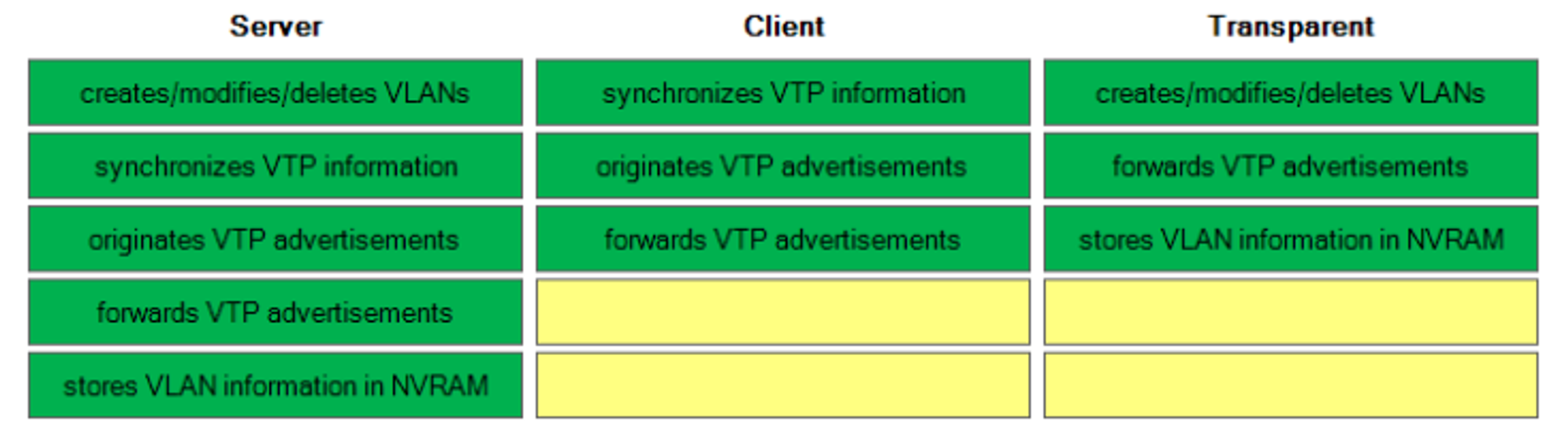- Forward VTP advertisements to other switches over trunk ports.