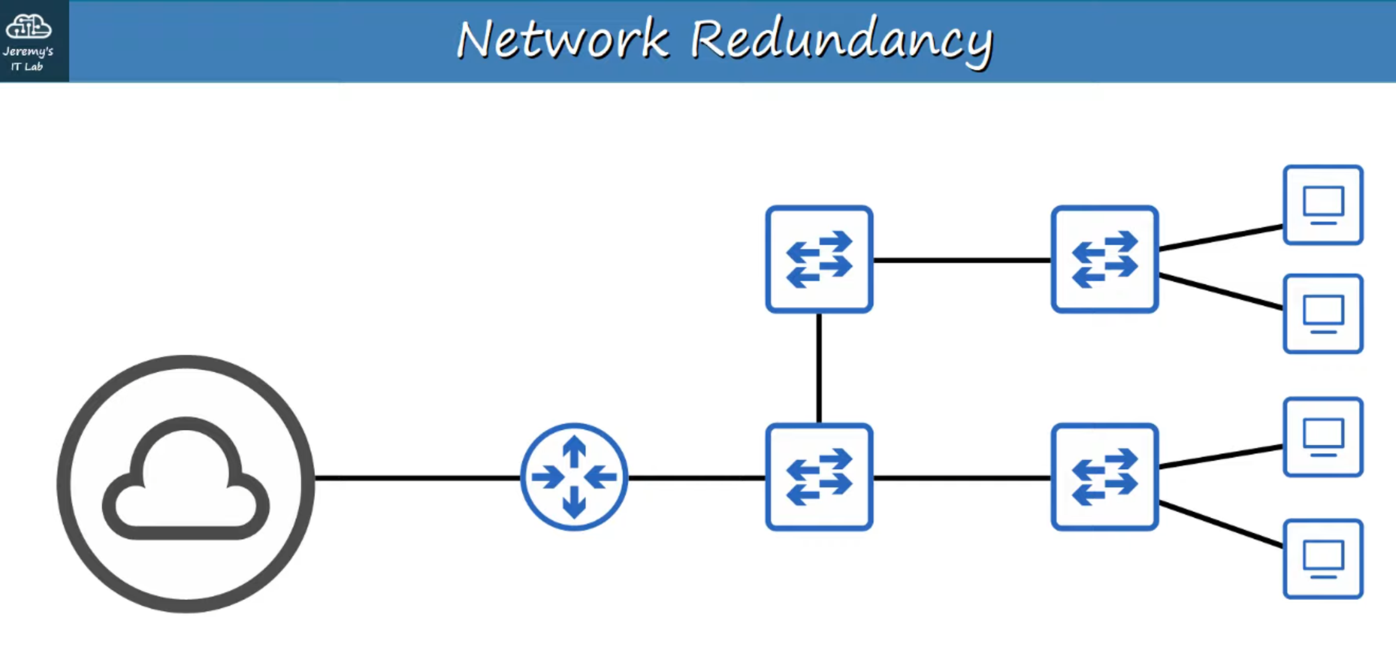 - This design has multiple single points of failure, where a single failure could disrupt the entire network.