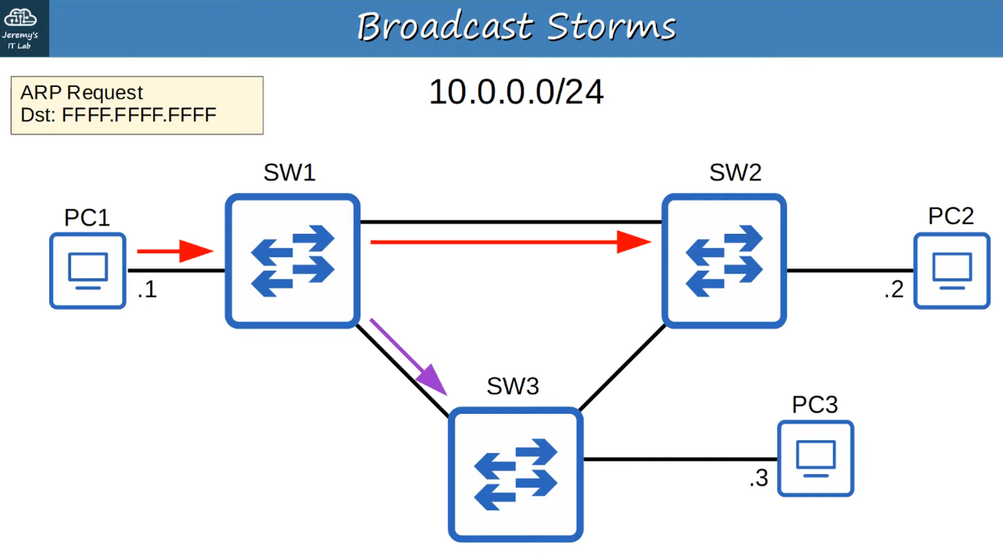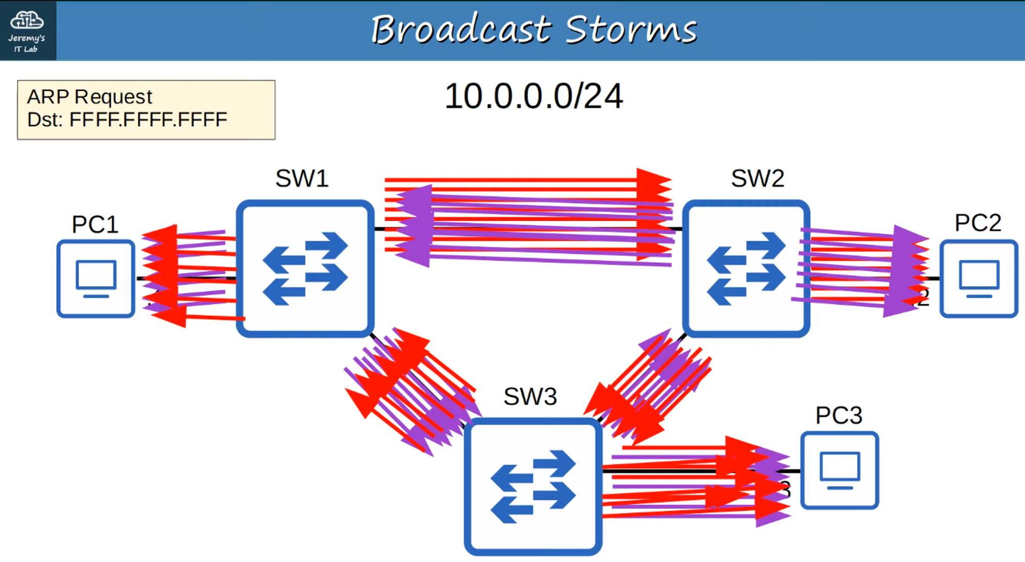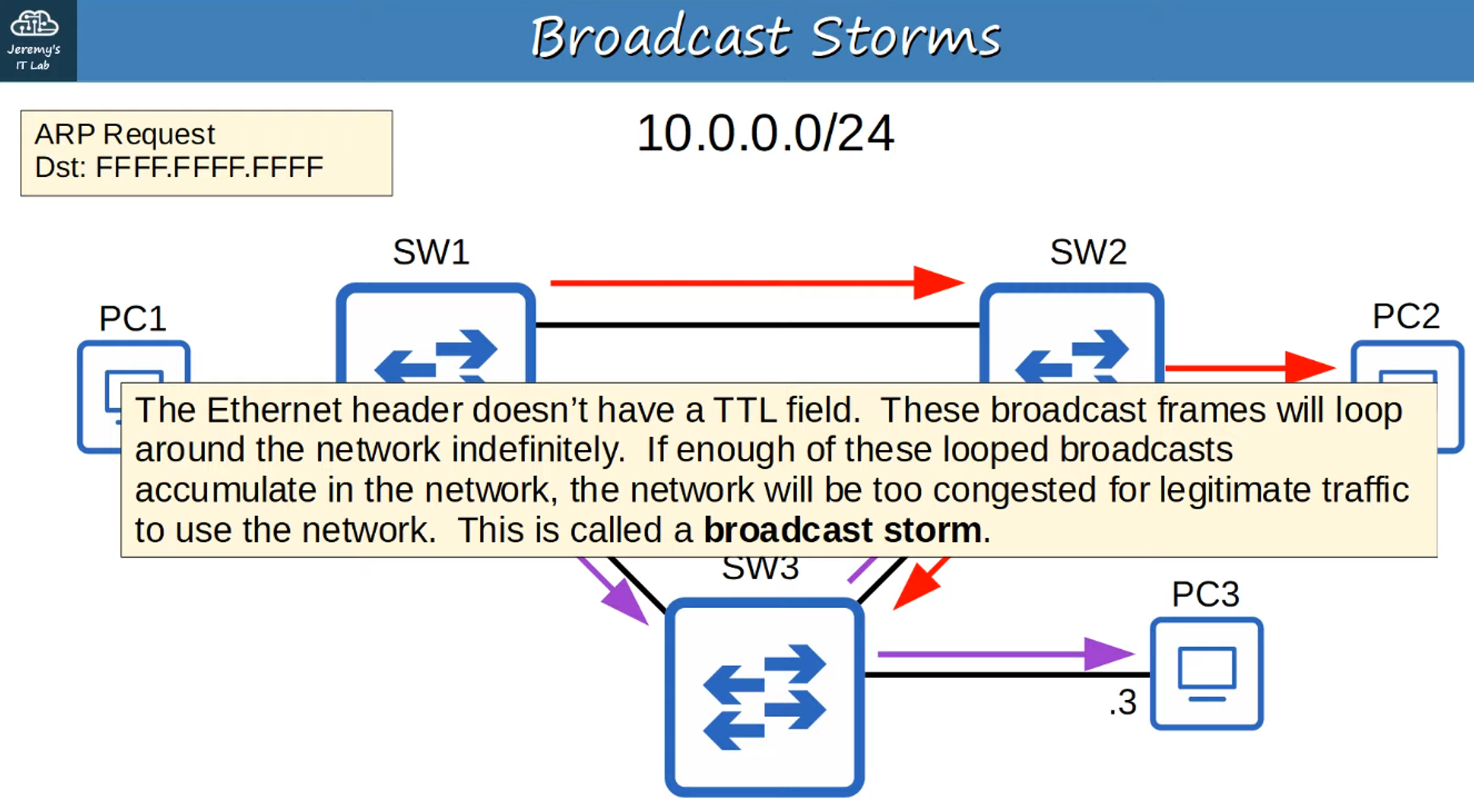 - A broadcast storm occurs when broadcast frames circulate endlessly in a loop, causing network congestion.