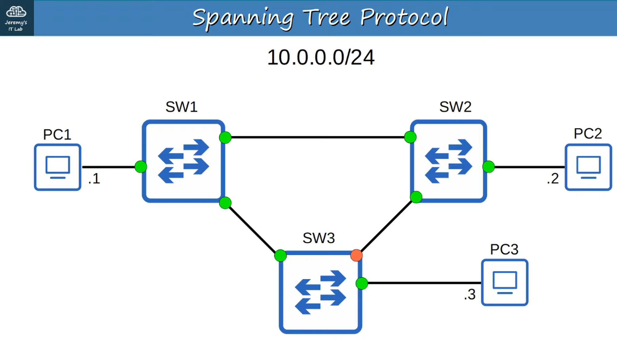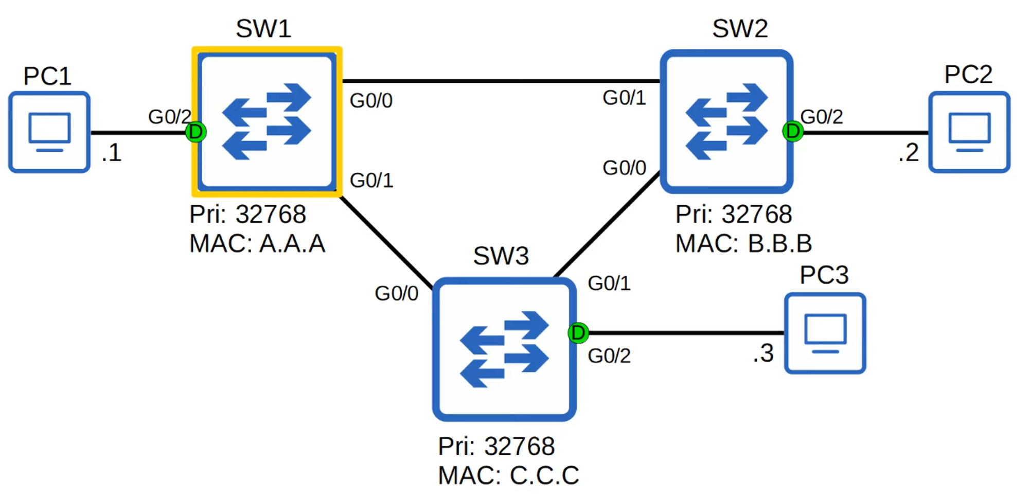 - SW3 has the lowest MAC address, so it becomes the Root Bridge, and all its interfaces become Designated Ports.