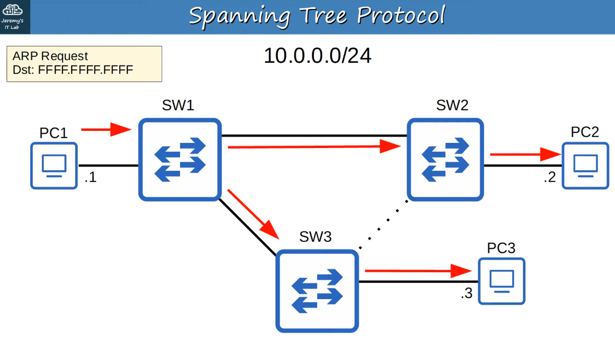 - In the example topology, SW1 becomes the Root Bridge due to its MAC address being the lowest.