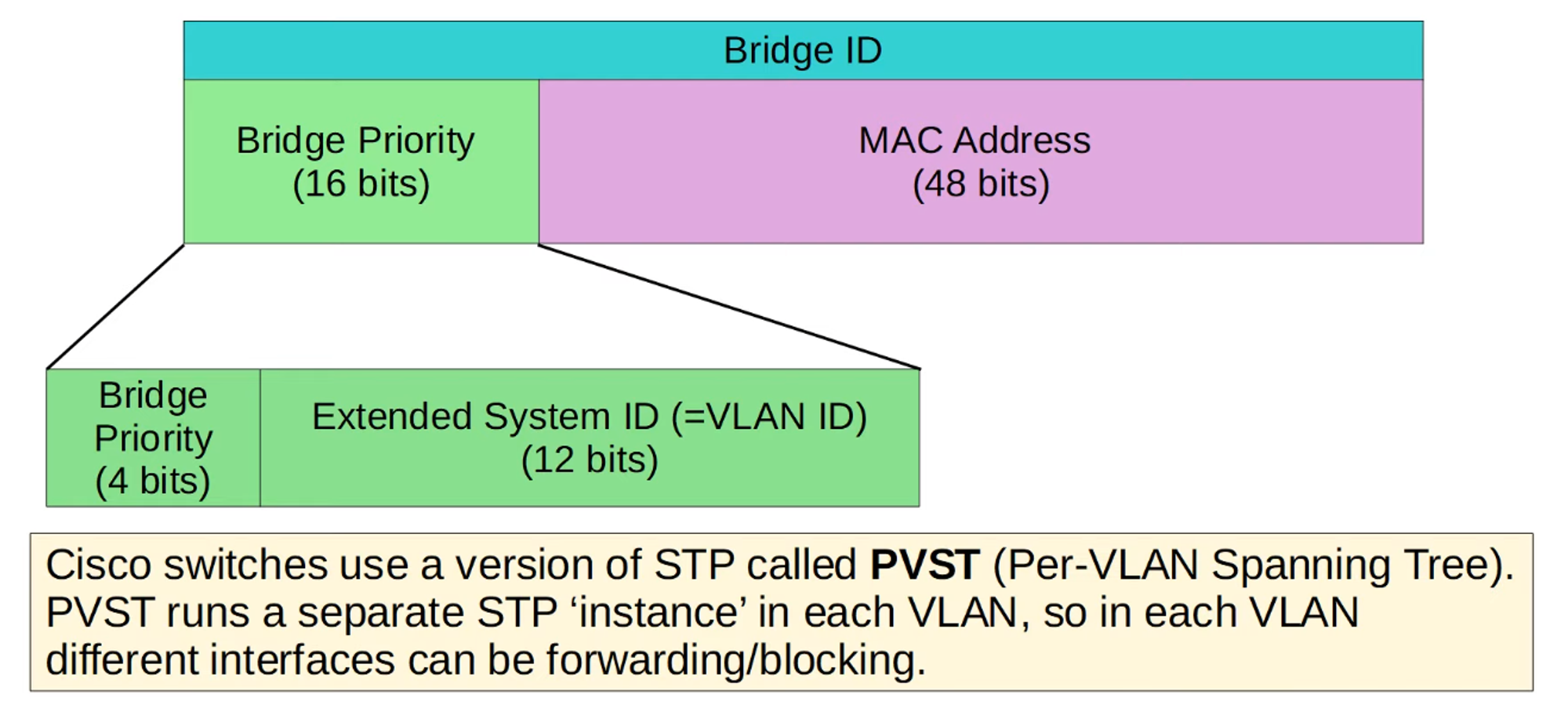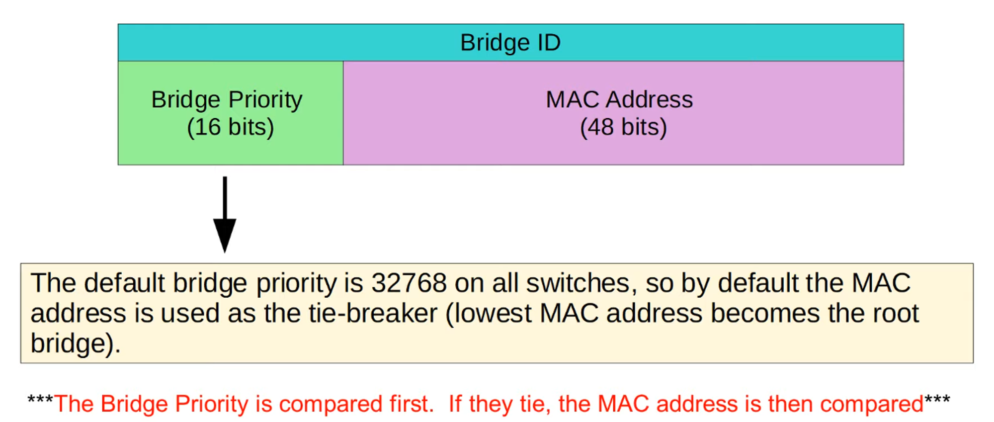 - If the Bridge ID is tied, the switch with the lowest MAC address wins.
