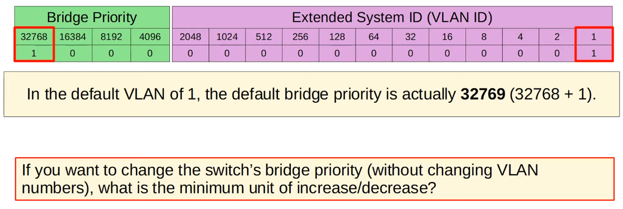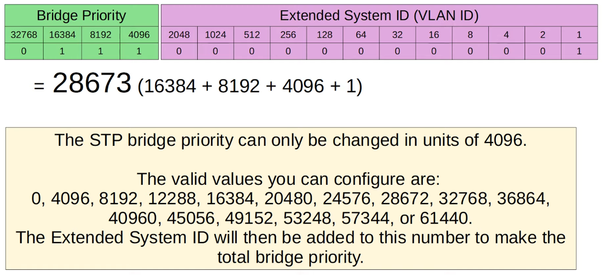 - Bridge Priority can be adjusted in increments of 4096 to influence which switch becomes the Root Bridge.
