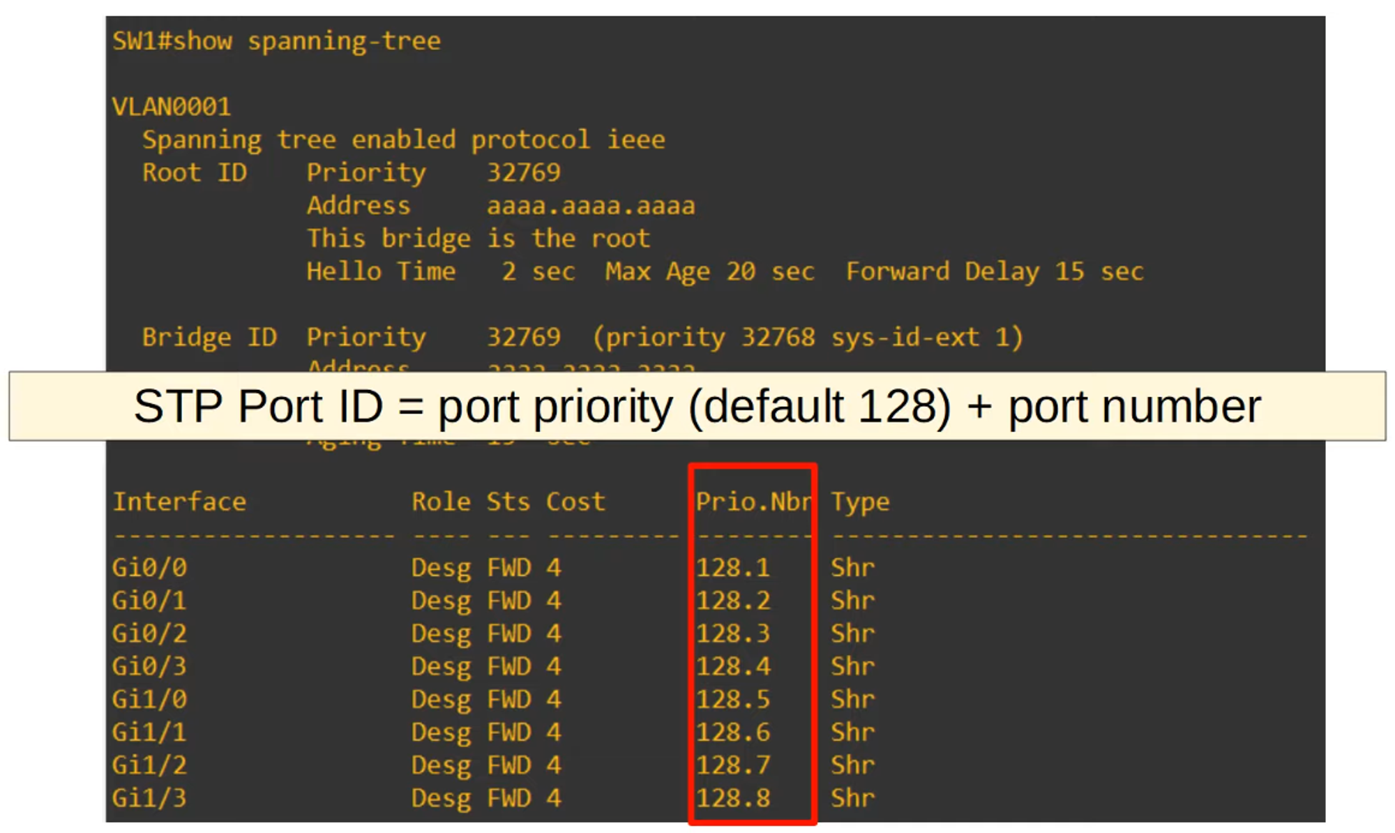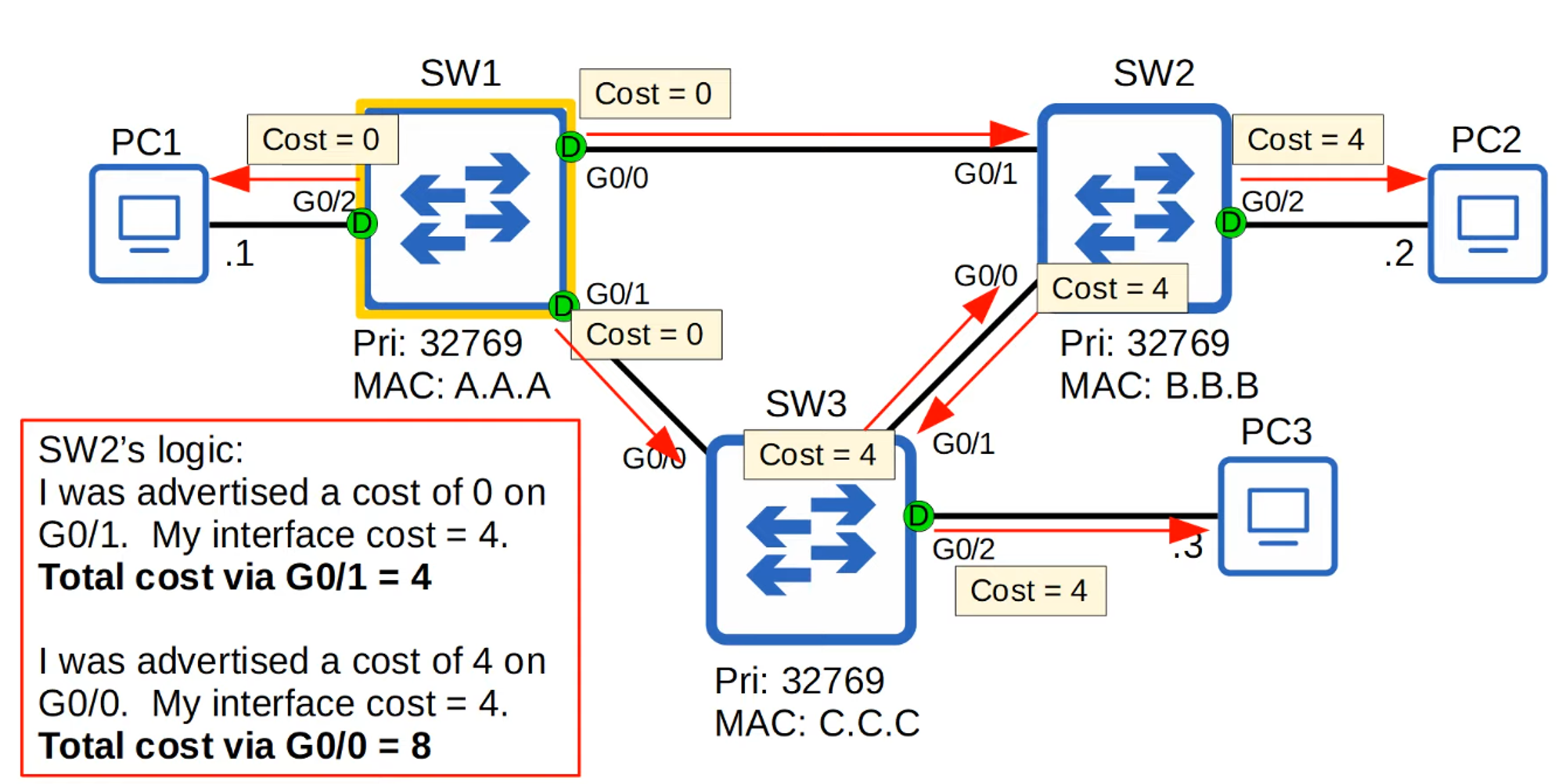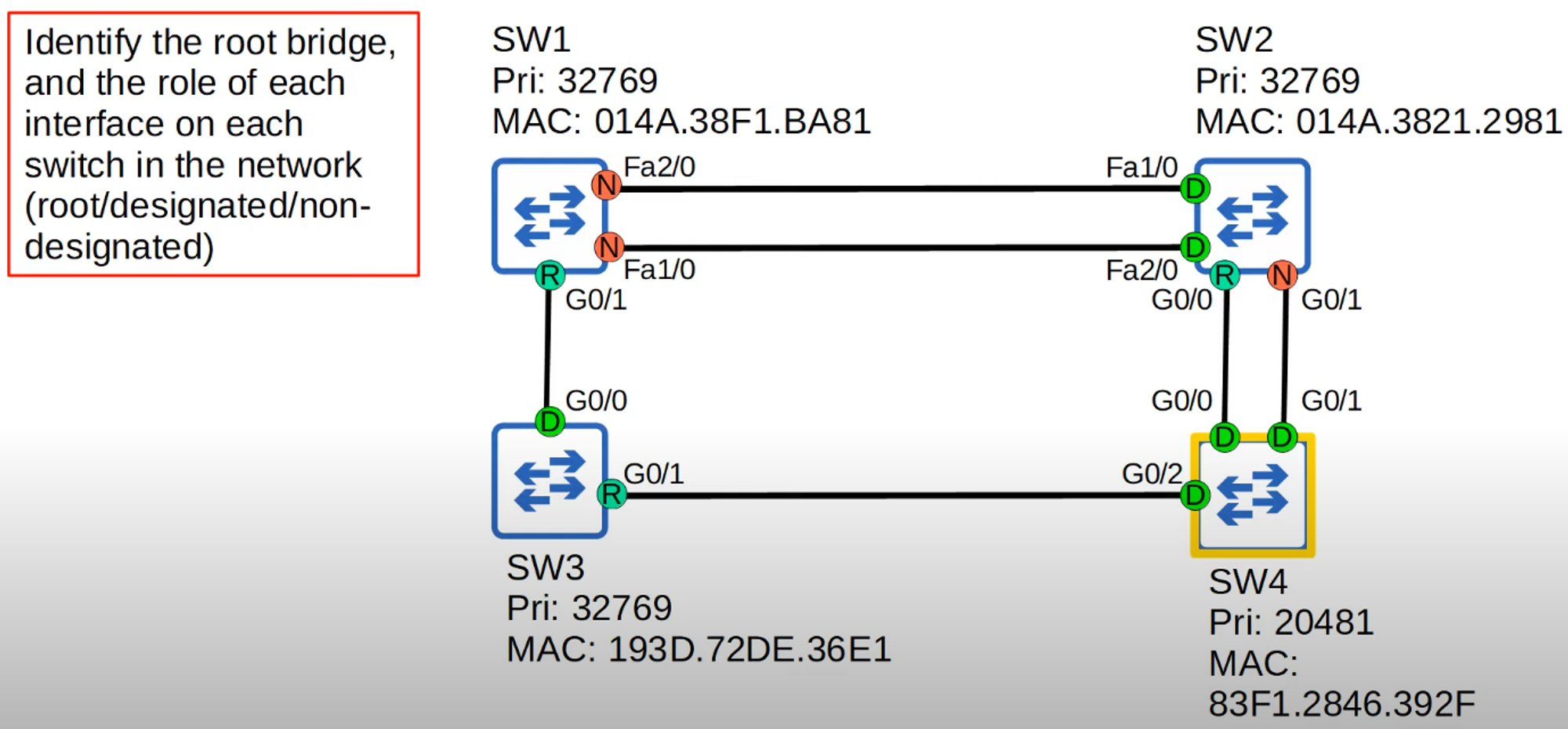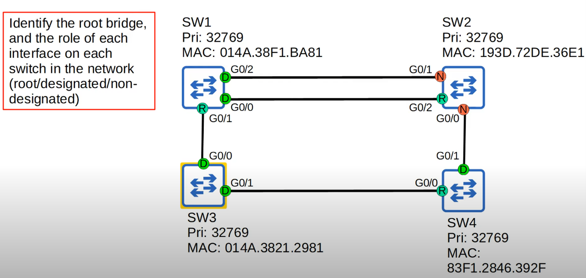 - All switches have the same priority number (32769), so the tiebreaker goes to the switch with the lowest MAC address.