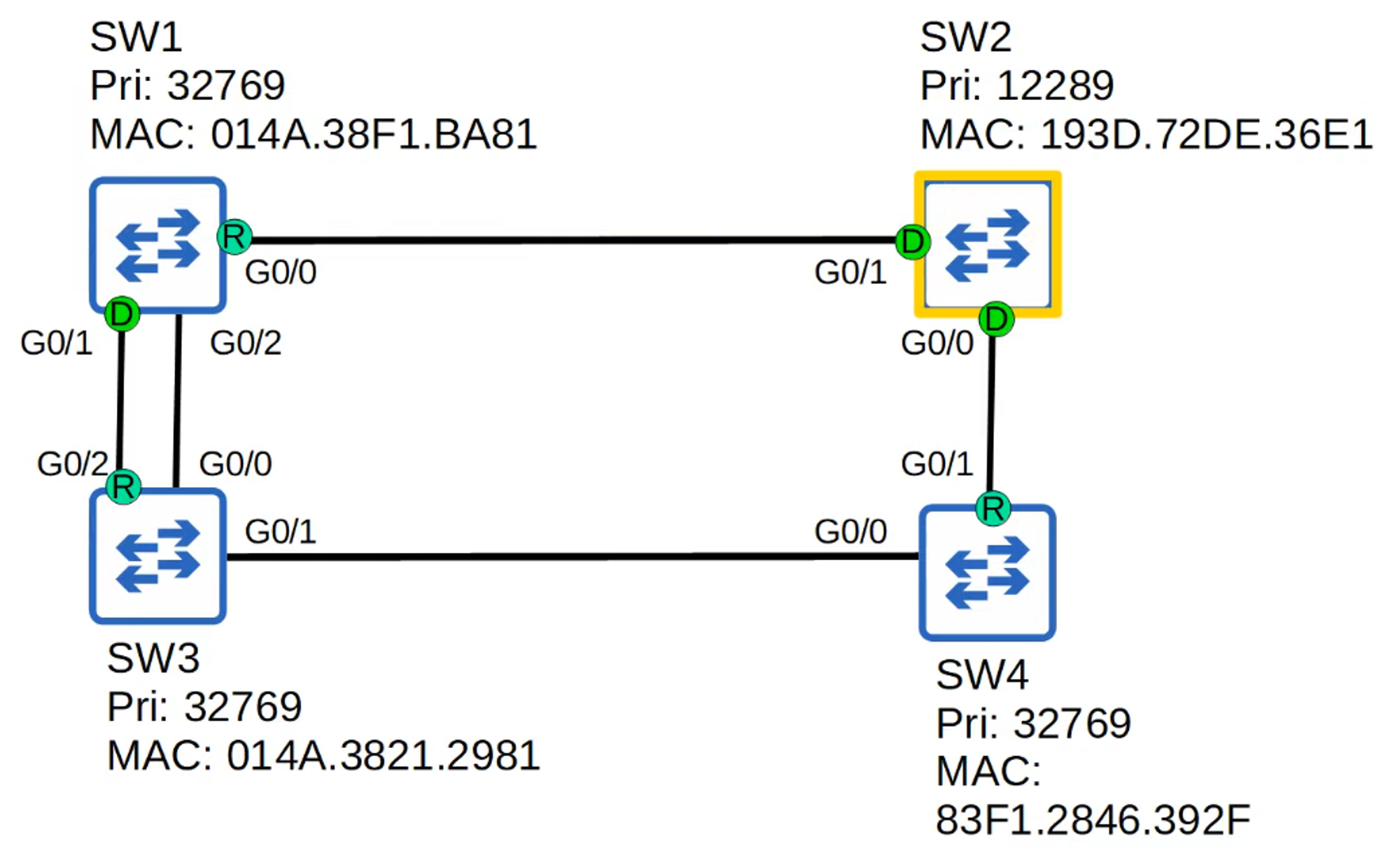 - SW4 has the lowest priority number, so it becomes the Root Bridge, and all its interfaces become Designated Ports.