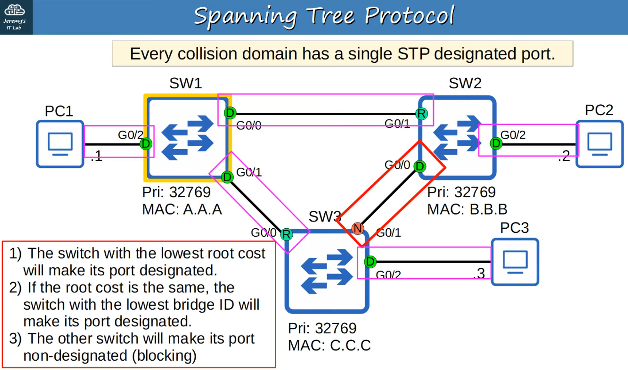 - In each collision domain, one interface is selected as the Designated Port (forwarding state).