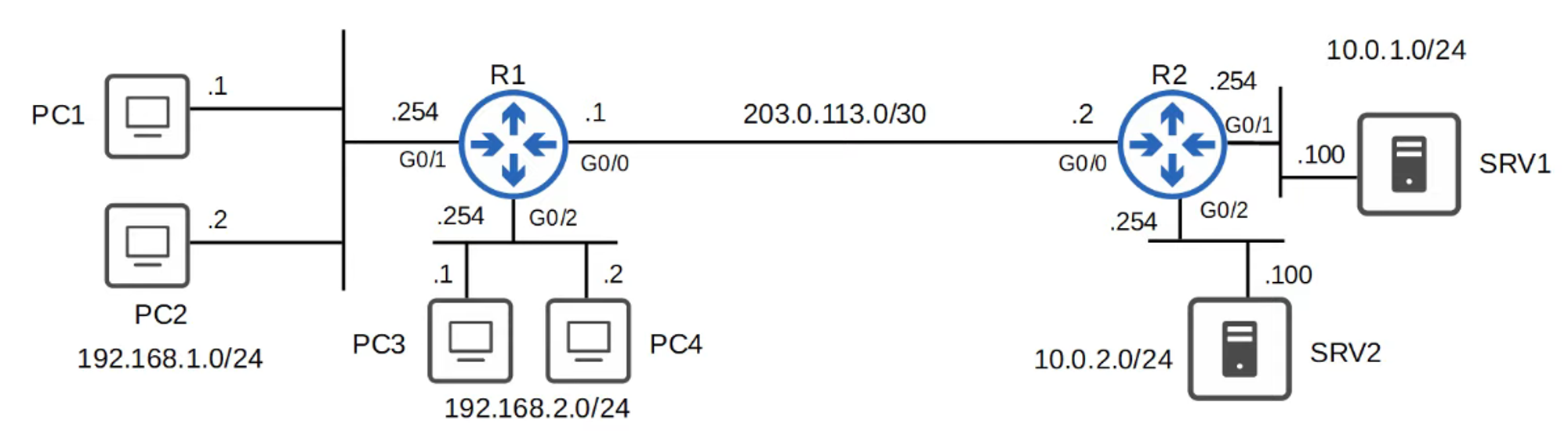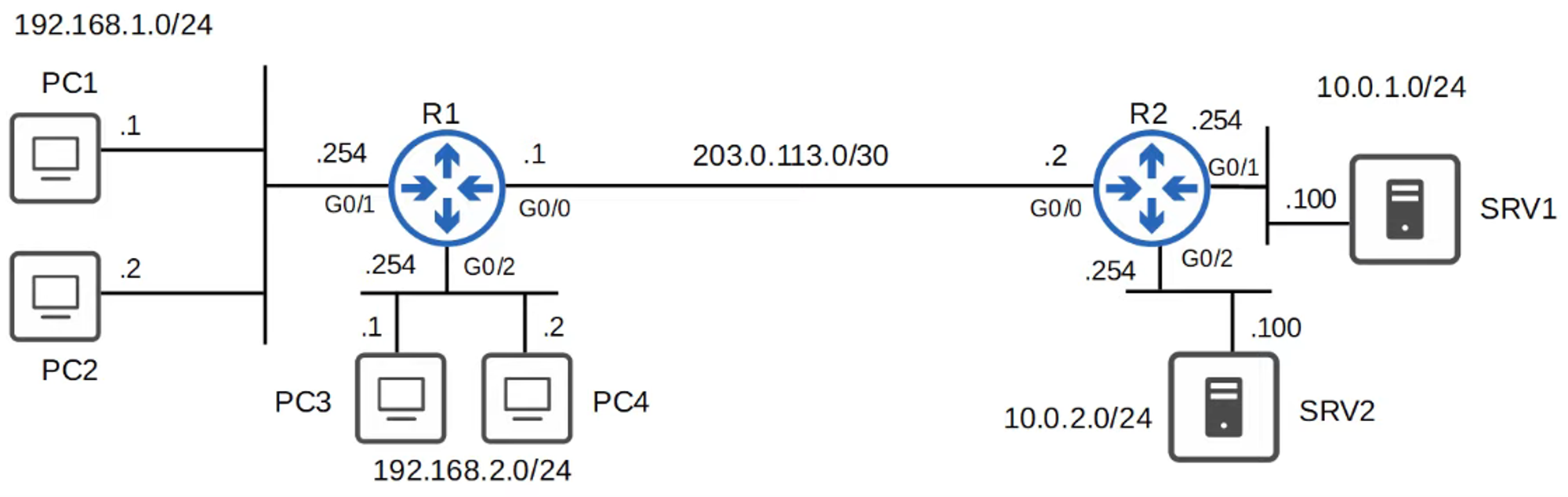 192.168.1.0/24network should have access to the10.0.1.0/24network. - Hosts in the