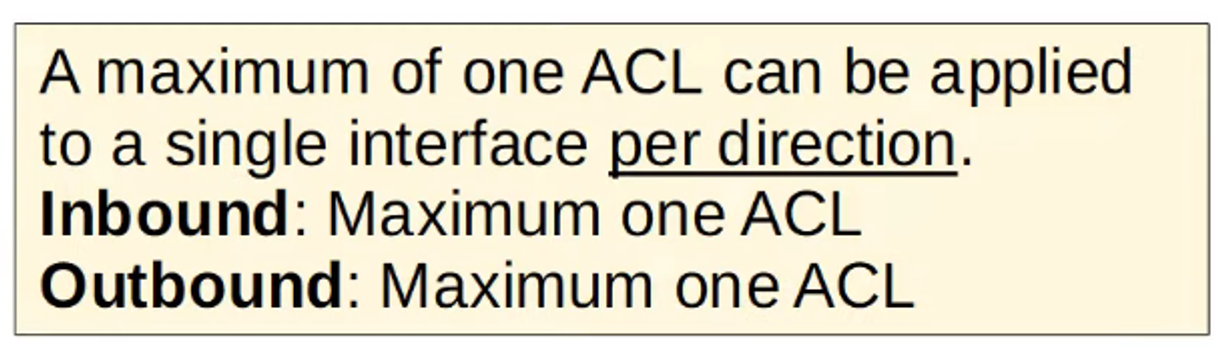 - ACLs can be applied either inbound (before the traffic enters the router) or outbound (before the traffic leaves the router).