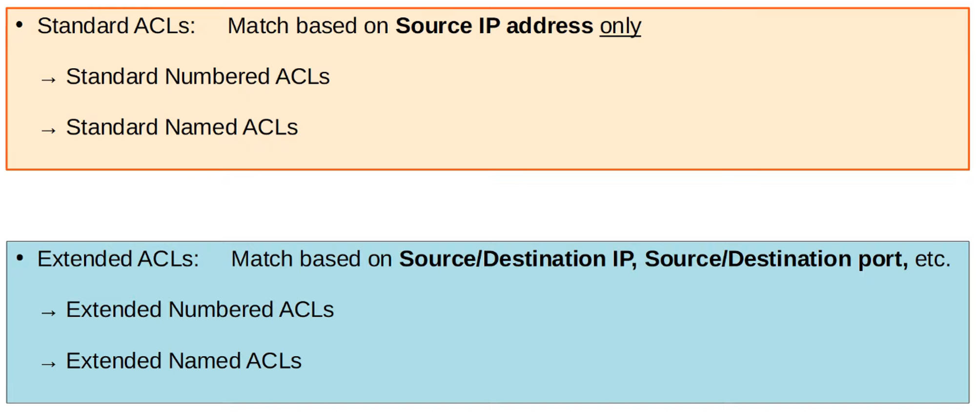 ACLs can be categorized into different types. For now, the focus is on Standard Numbered ACLs and Standard Named ACLs.