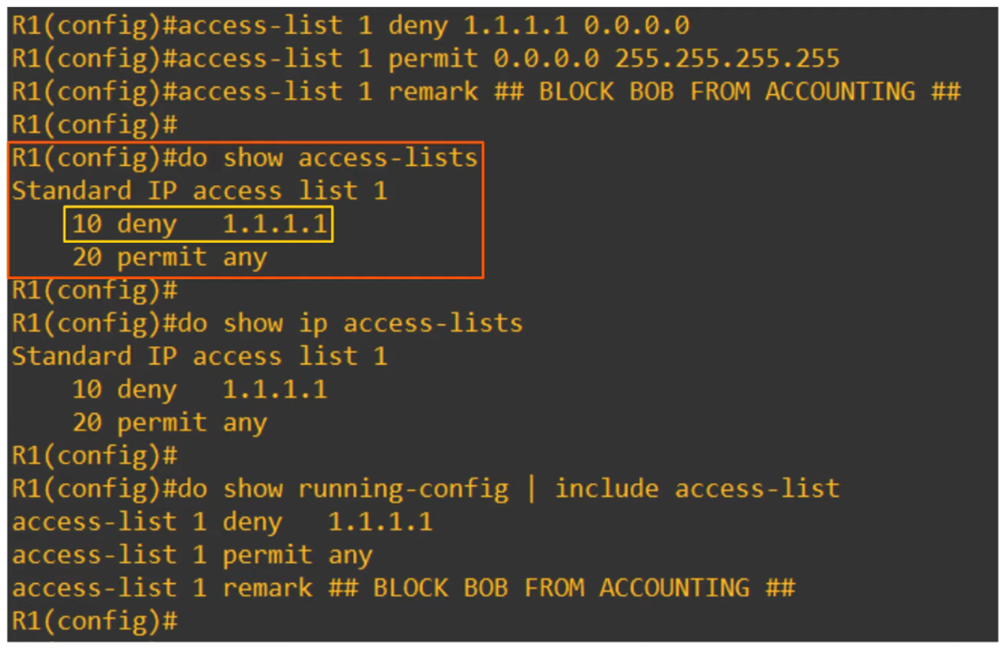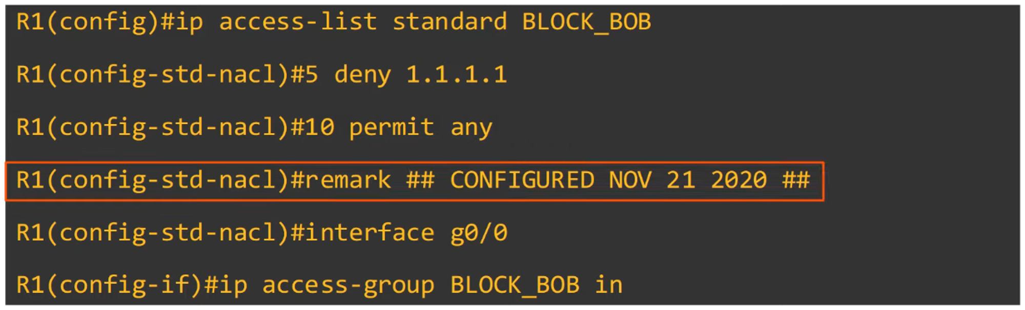 R1(config)# access-list 1 remark ## BLOCK BOB FROM ACCOUNTING ##