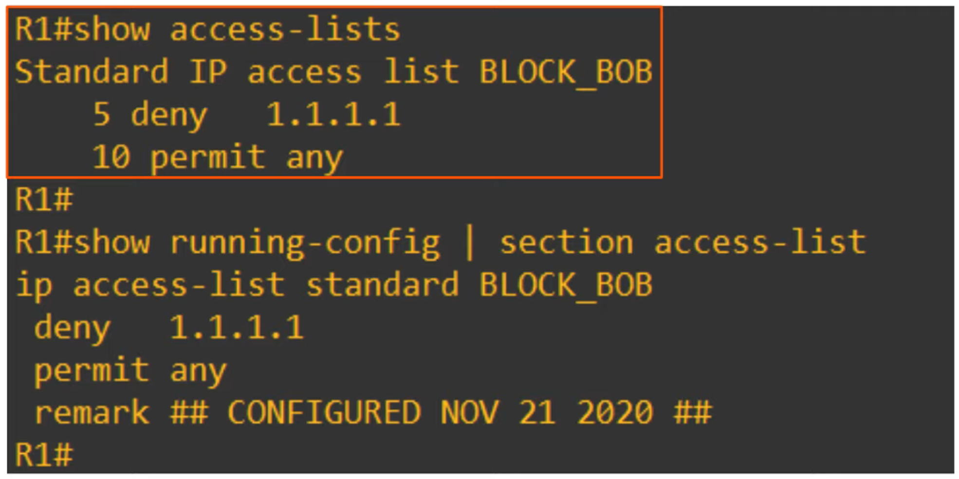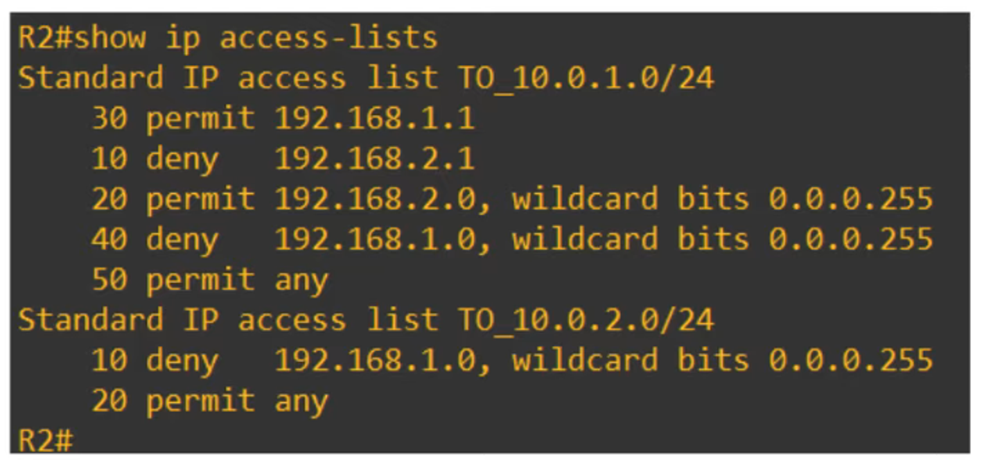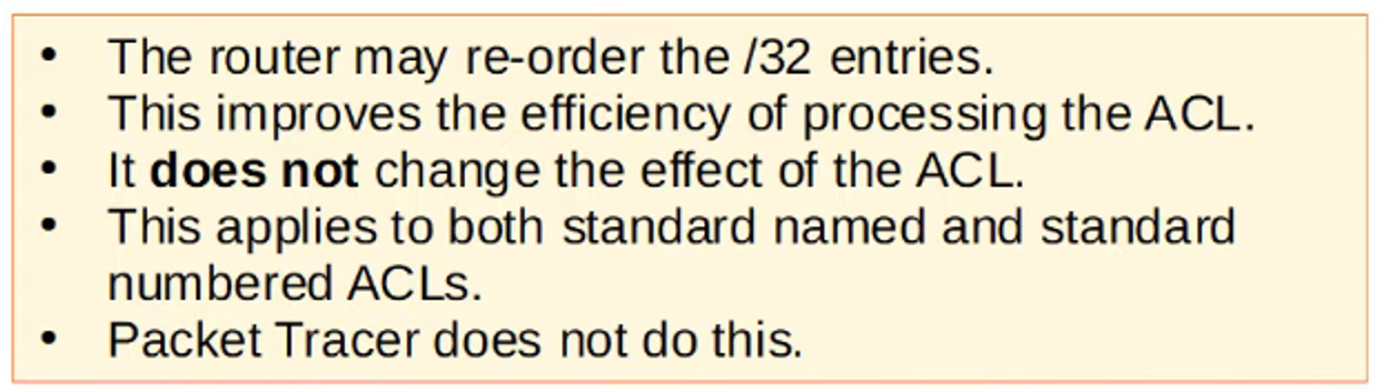 When viewing an ACL’s configuration, you might notice that the entries may be reordered based on their sequence numbers. This happens on some platforms or tools (like Cisco Packet Tracer), which might not reorder the entries automatically.