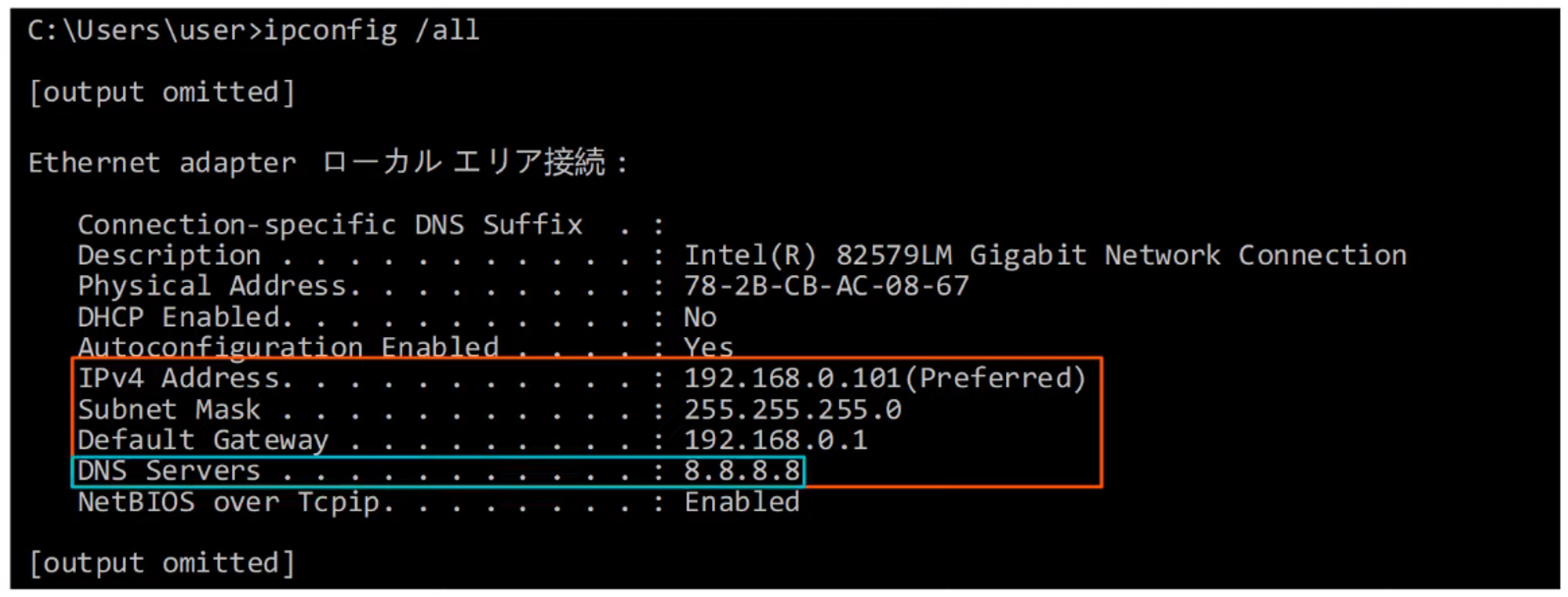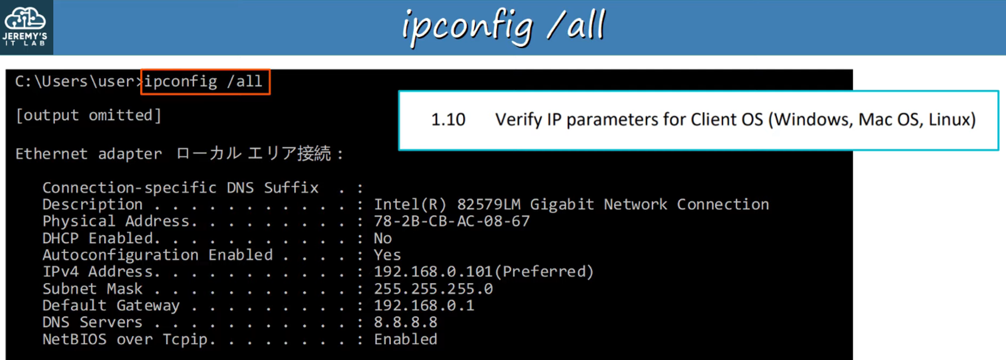 ipconfig /allcommand to display the local IP configuration of the current device.