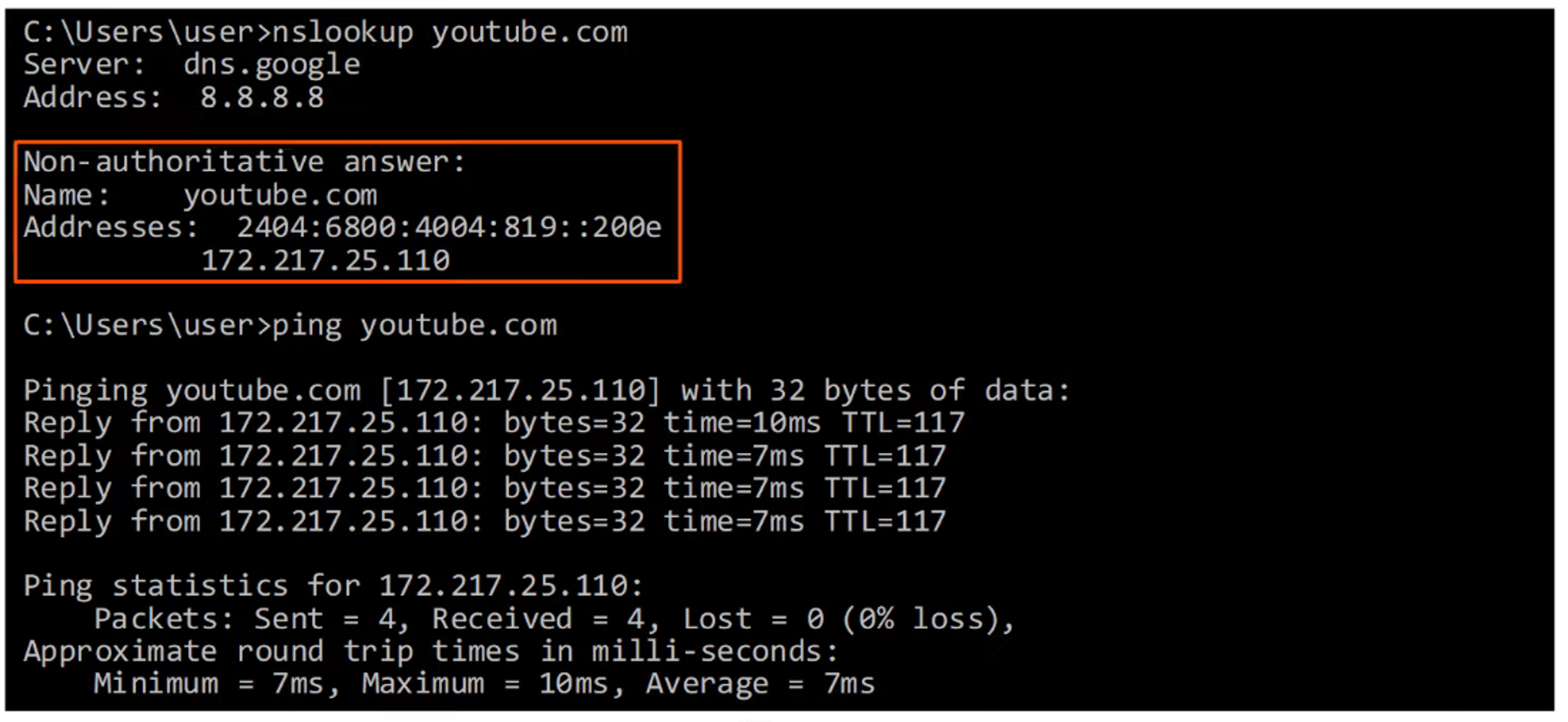 nslookupcommand shows the IP address information for a given DNS entry (domain name).