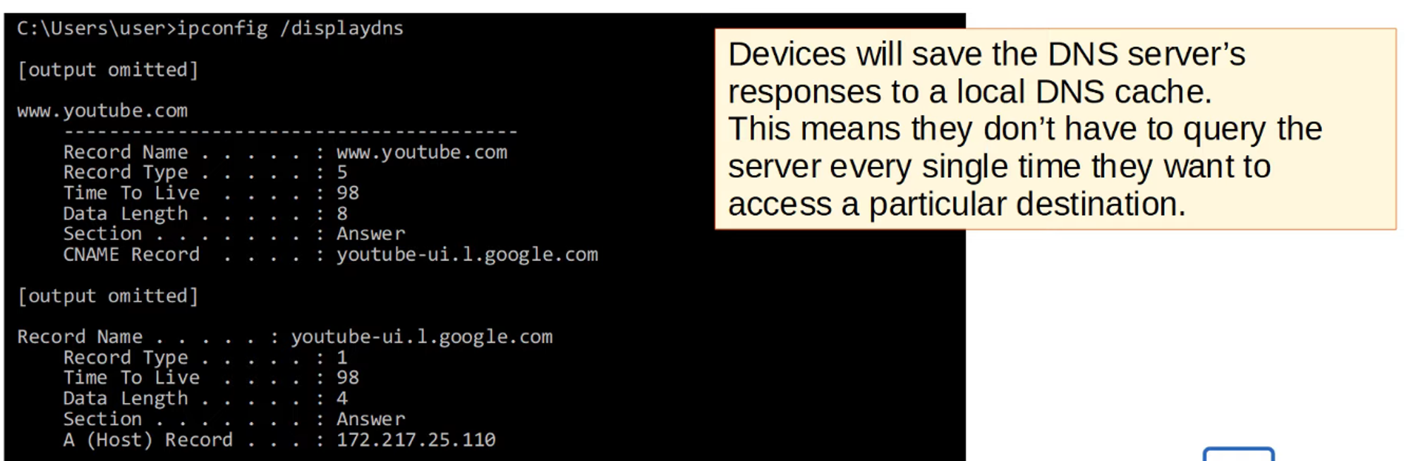 ipconfig /displaydnsshows the DNS cache stored on the device.