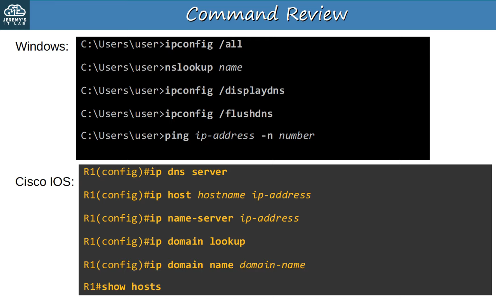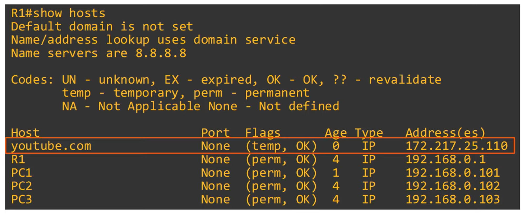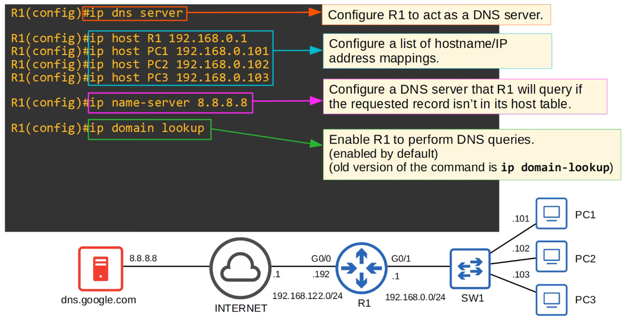 ip dns serverβ Enables DNS server functionality on the router.ip host <hostname> <ip address>β Manually assigns a hostname to an IP address.