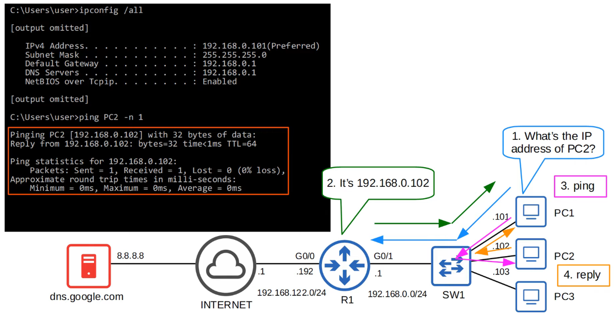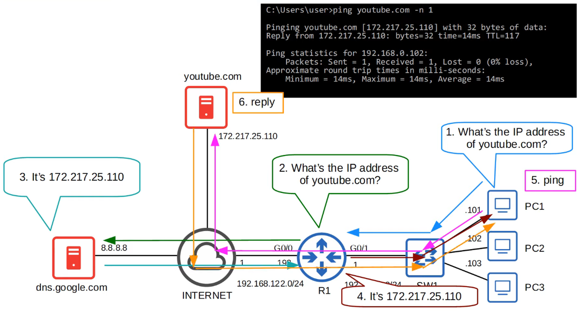 google.com) into IP addresses. - Machines (such as PCs) do not use names; they use IP addresses (IPv4 or IPv6).