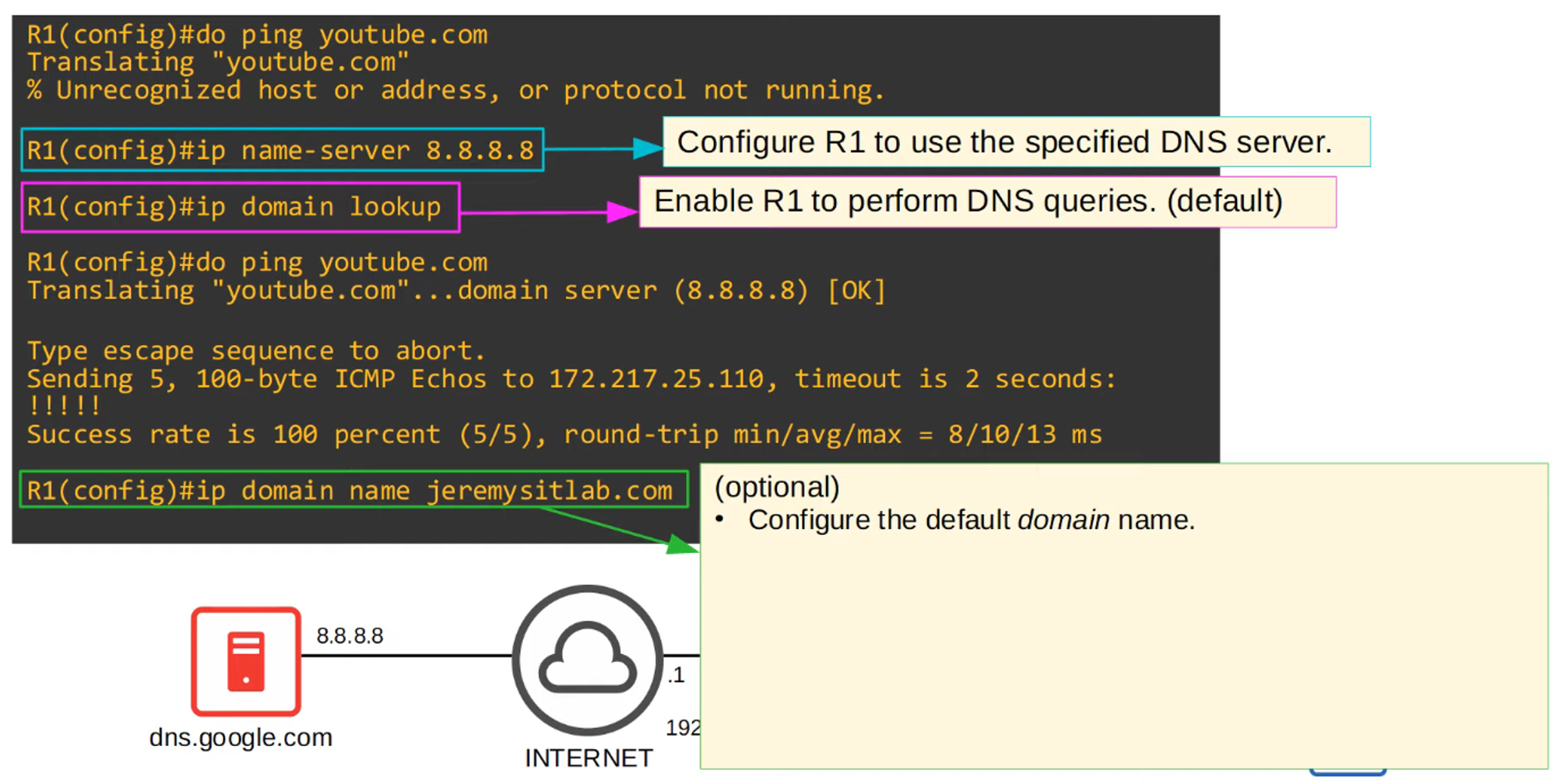 ip name-server <ip>β Specifies the DNS server(s) the router will use for DNS lookups.ip domain lookupβ Enables DNS lookup on the router.