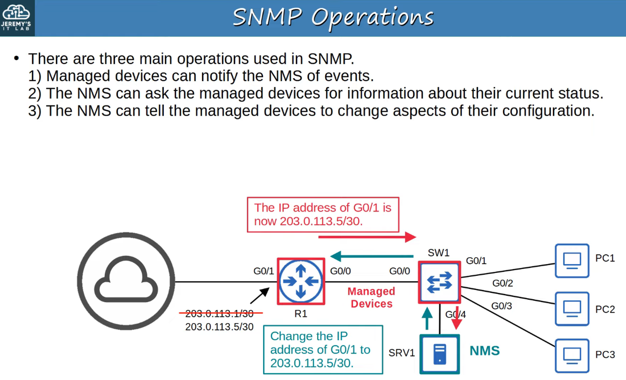 - When an interface goes down, an SNMP trap is sent from the managed device (R1) to the NMS.