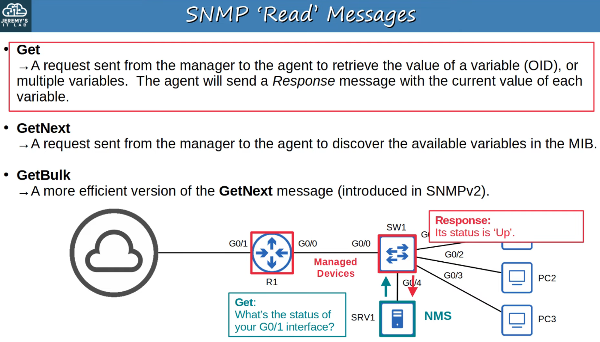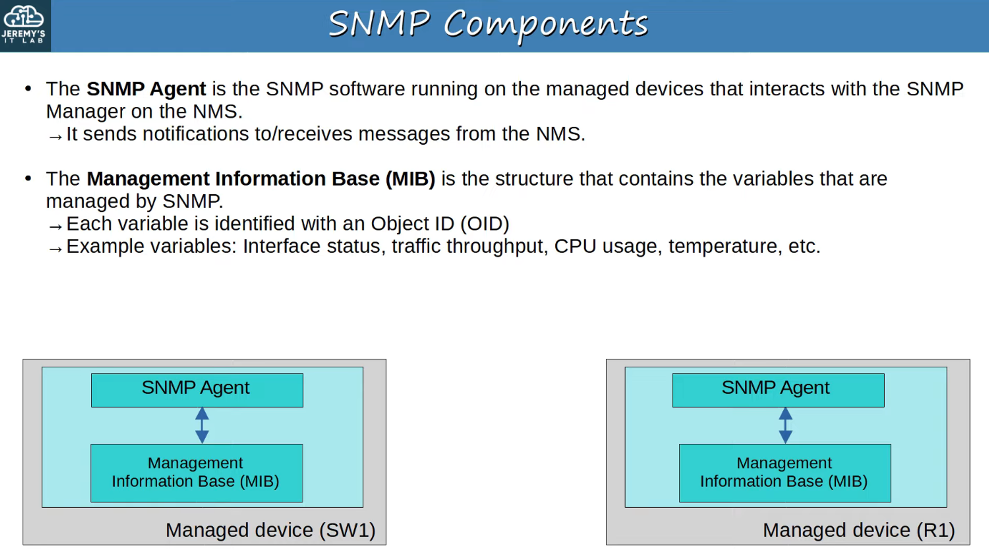 - Variables such as interface status, temperature, traffic load, and hostname are stored in the MIB, and each is assigned a unique Object ID (OID).