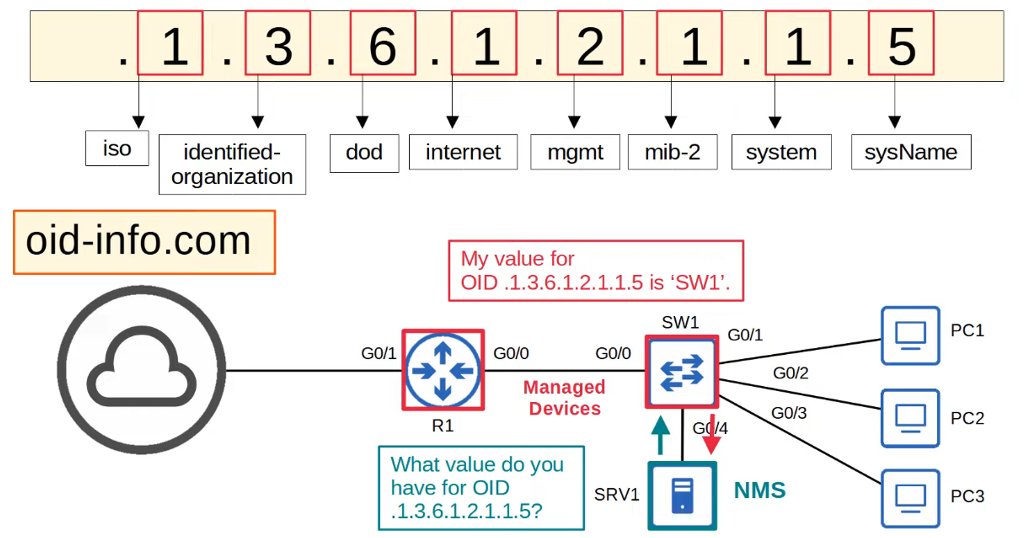 - OIDs: SNMP Object Identifiers are organized hierarchically, allowing the NMS to access specific data points from managed devices. Each data point (like interface status or device temperature) is assigned a unique OID within the MIB (Management Information Base).