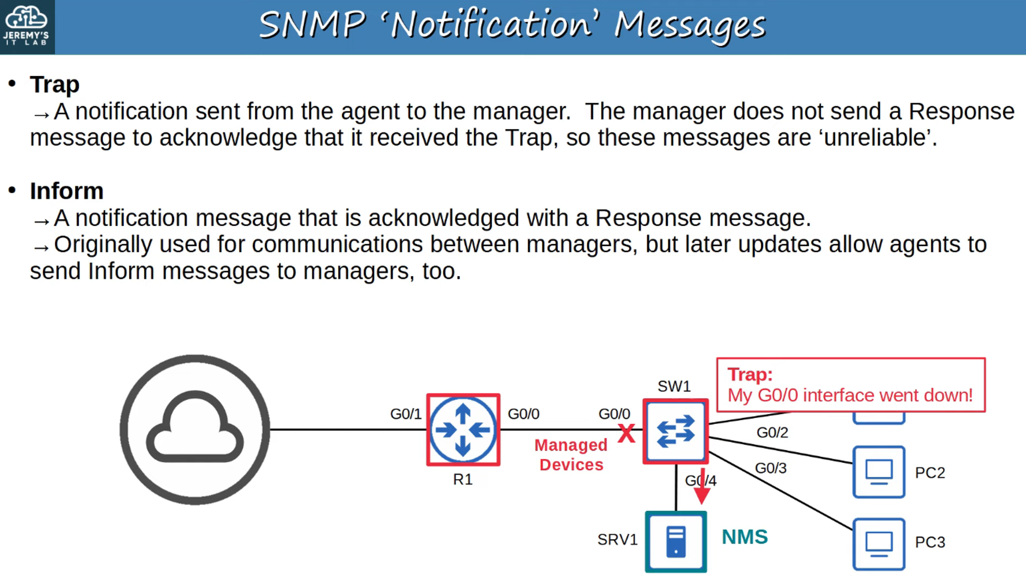 - Managed devices send notifications to the NMS to report issues or significant events.