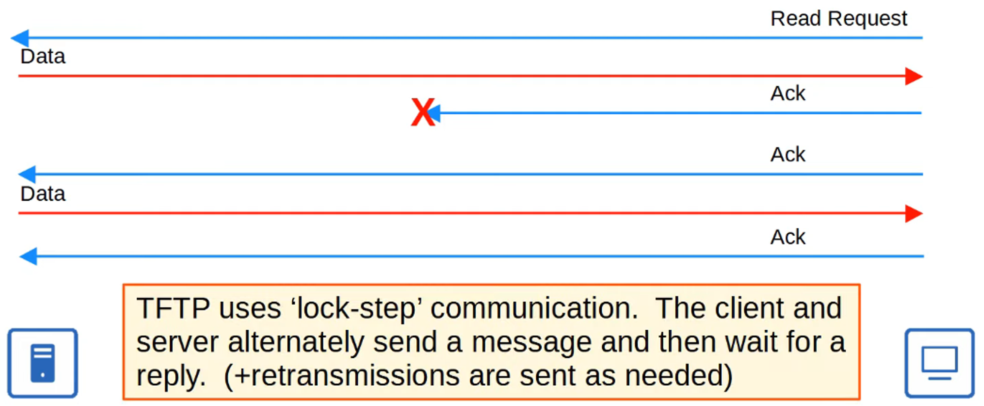 - Connectionless: Utilizes UDP, which does not provide reliability through retransmissions. However, TFTP incorporates built-in features for acknowledgment.