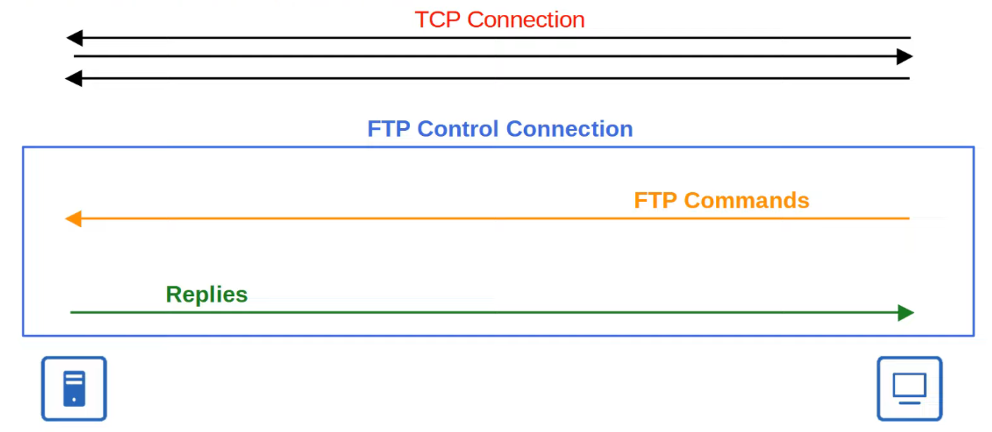 - Control Connection: Established over TCP Port 21 to send FTP commands and replies.