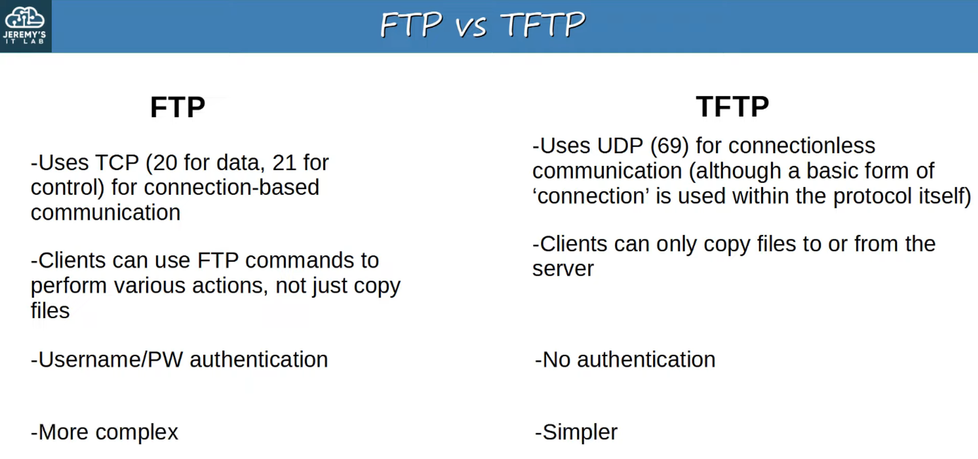FTP (File Transfer Protocol) and TFTP (Trivial File Transfer Protocol) are industry-standard protocols used for transferring files over a network. Both utilize a client-server model: