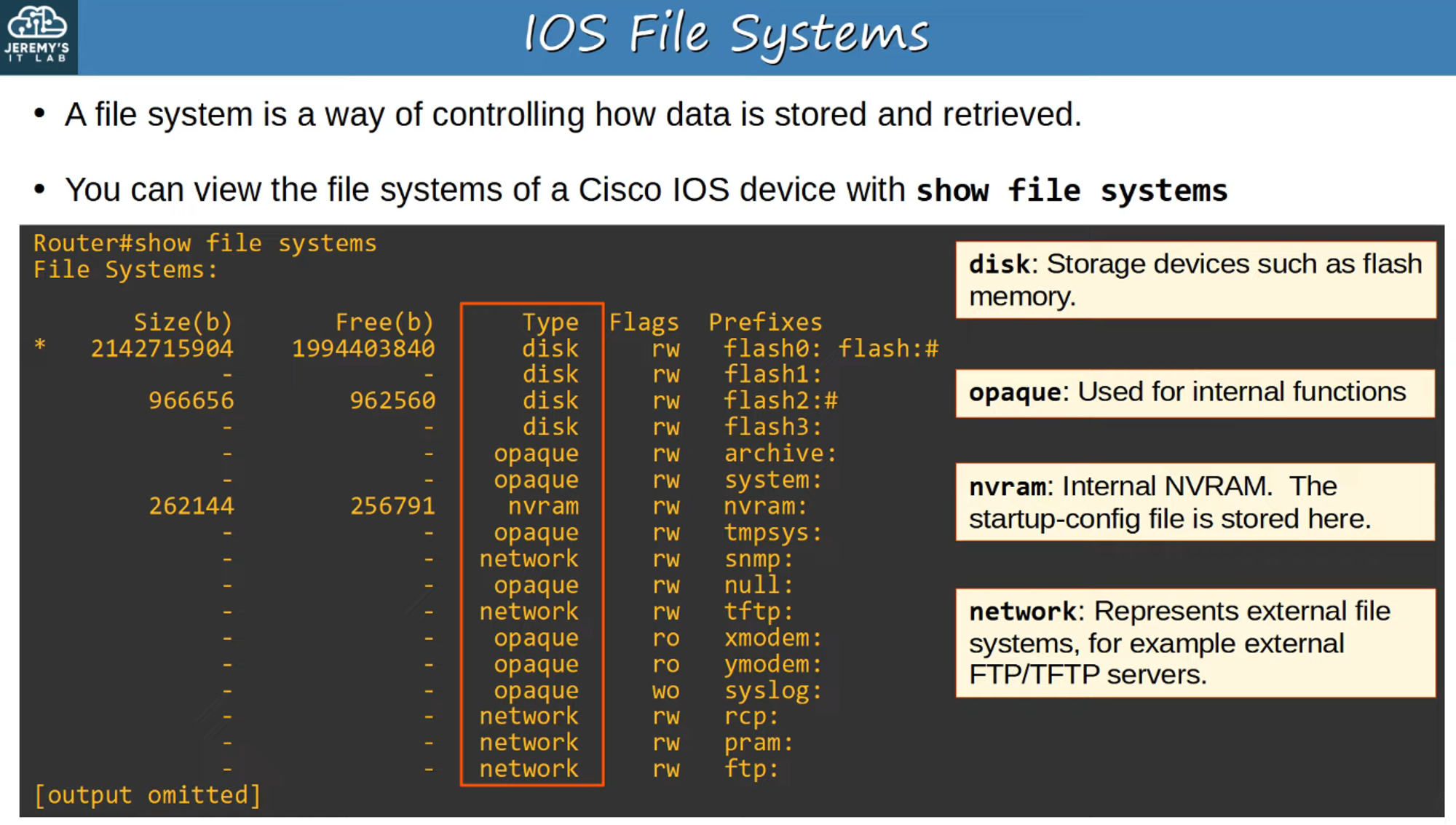 A file system is a method of controlling how data is stored and retrieved. You can view the file system of a Cisco IOS device using the command: