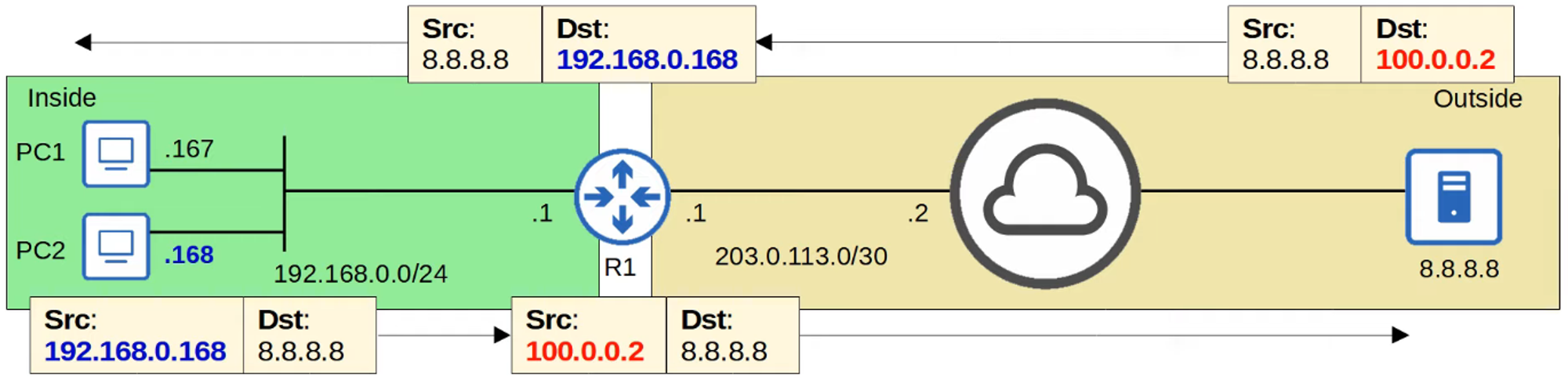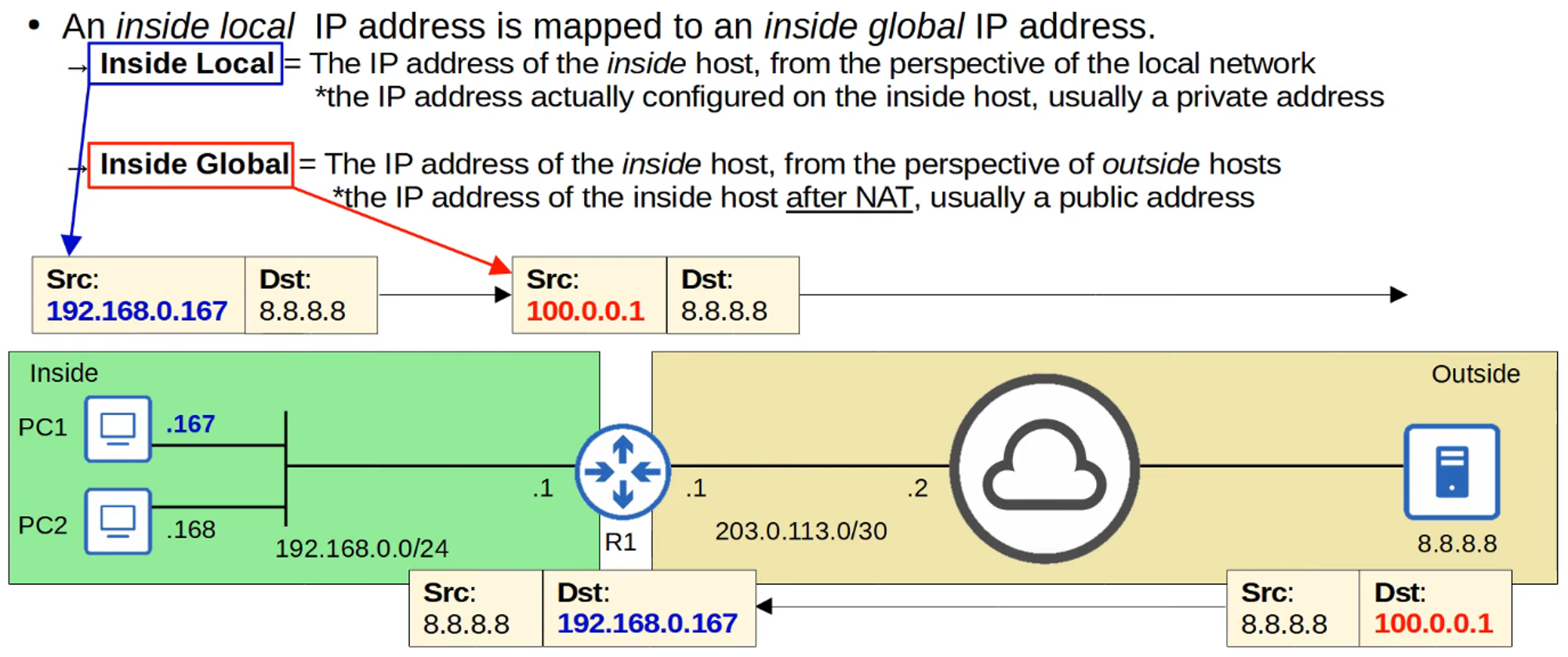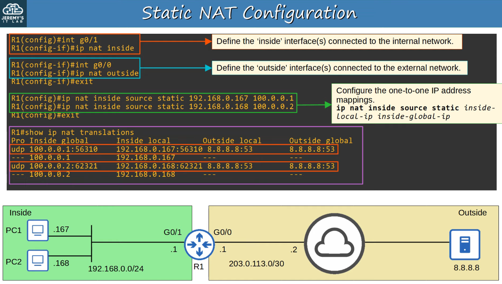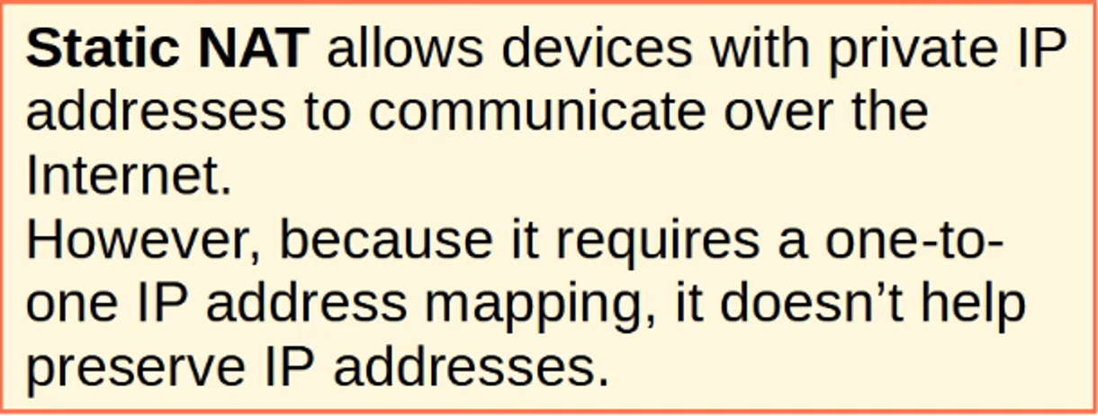 - Static NAT involves configuring one-to-one mappings between private IP addresses and public addresses. This means that each private IP address has a fixed corresponding public IP address.