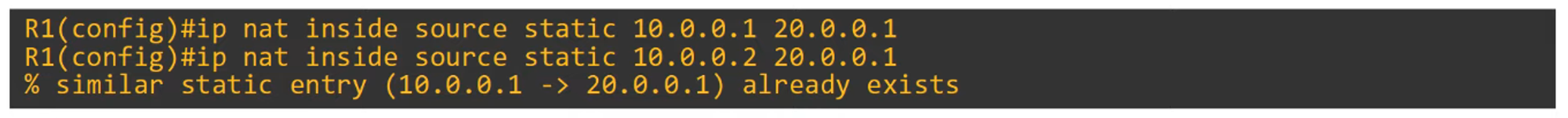 - A private IP address cannot be mapped to the same global IP address multiple times; the second mapping will be rejected.