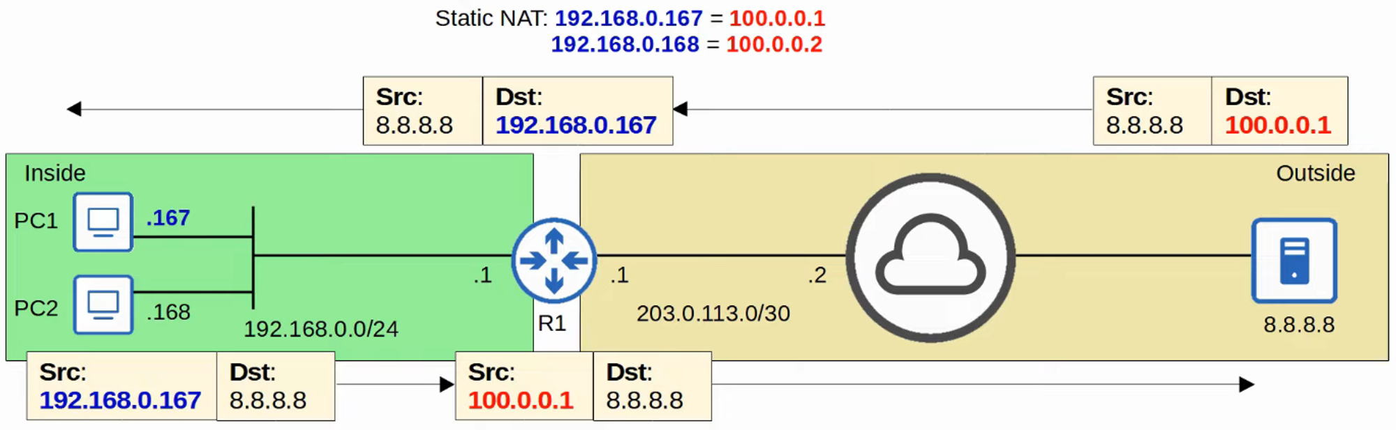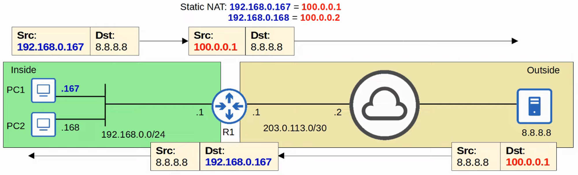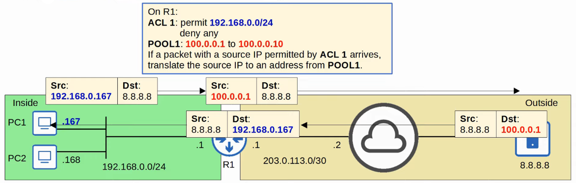 - Despite being dynamically assigned, the mappings remain one-to-one (one inside local IP address per inside global IP address).