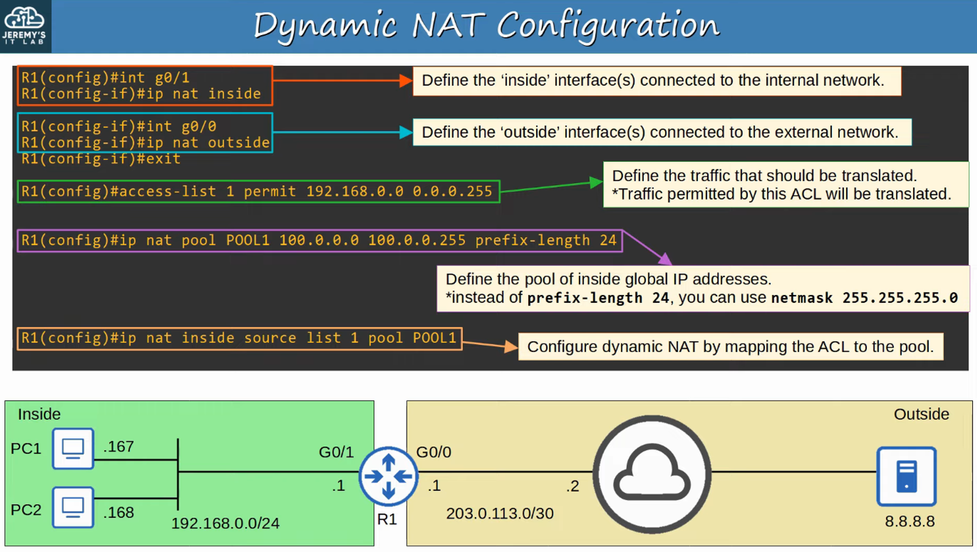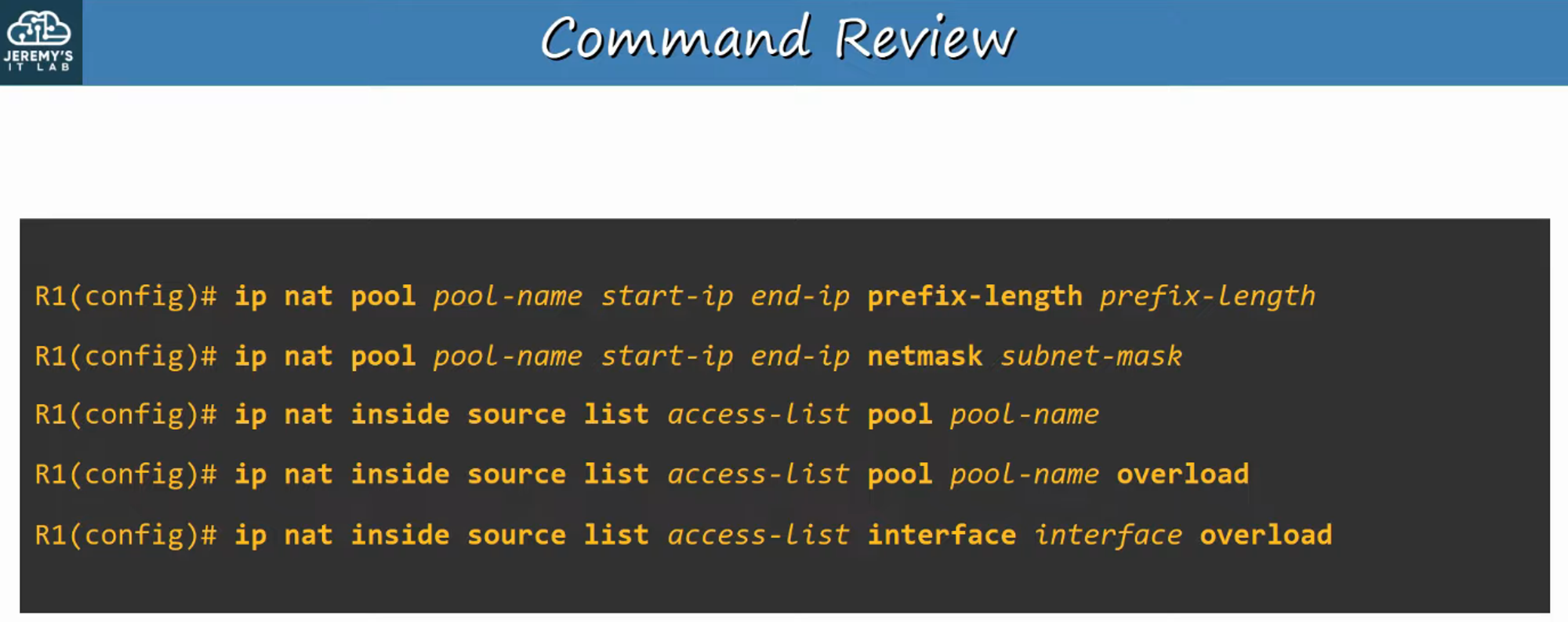 A summary of key commands related to Dynamic NAT and PAT configurations.