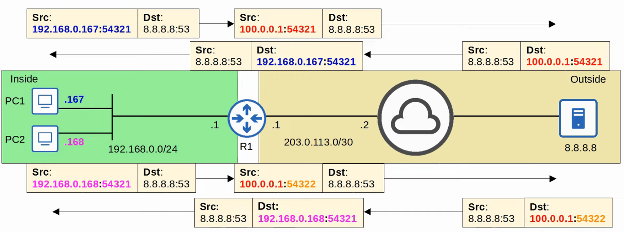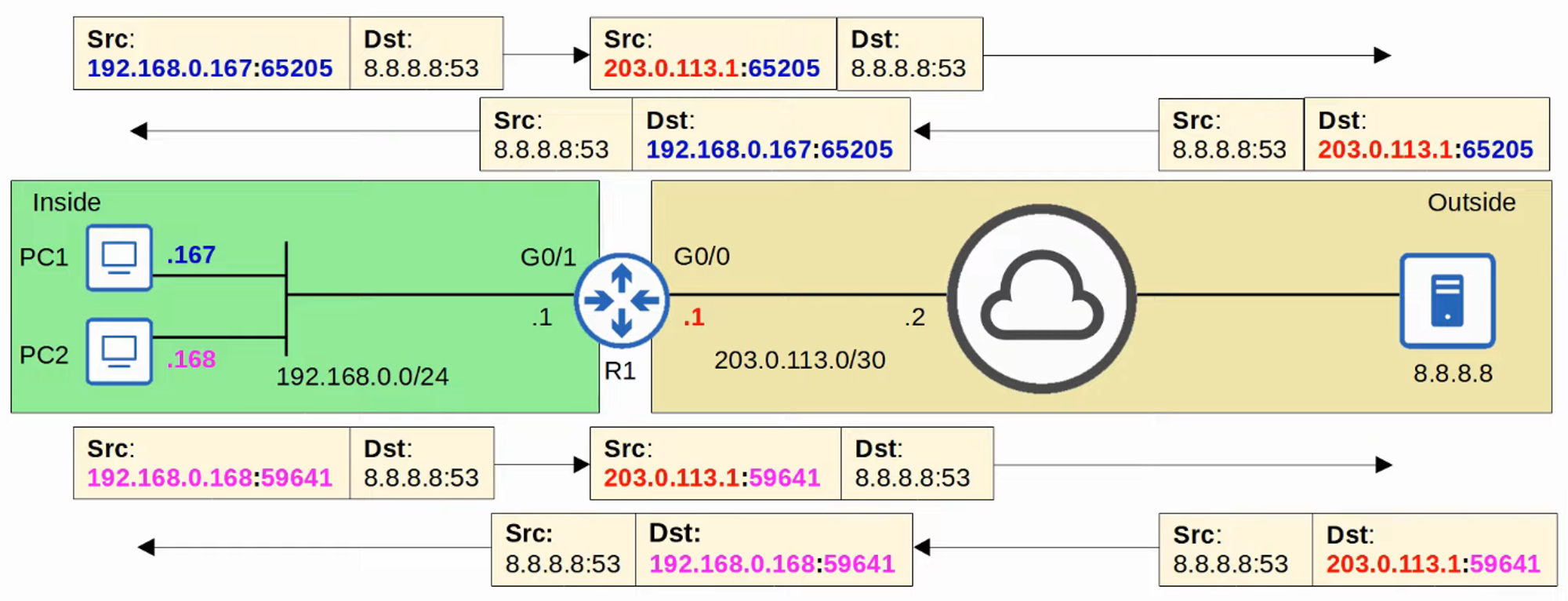 - The router tracks which inside local address is using which inside global address and port.