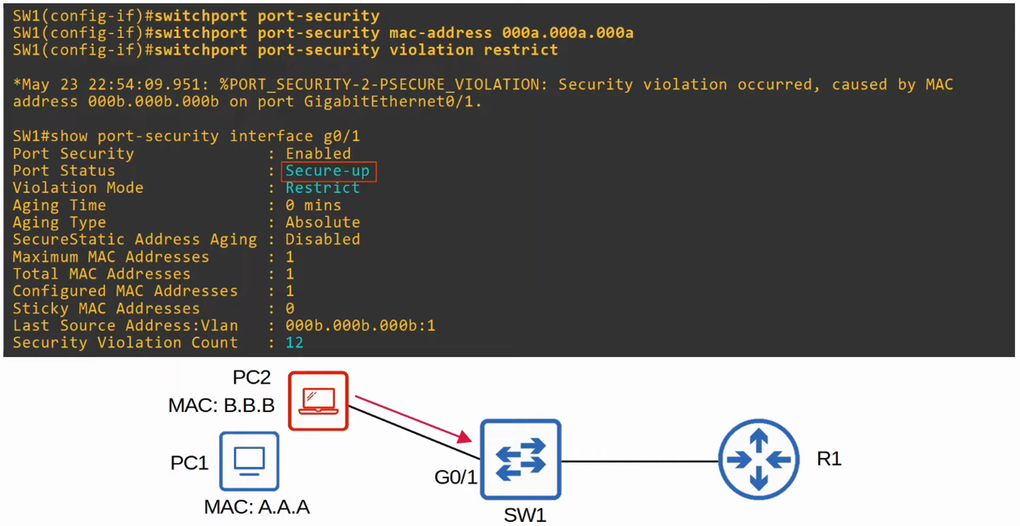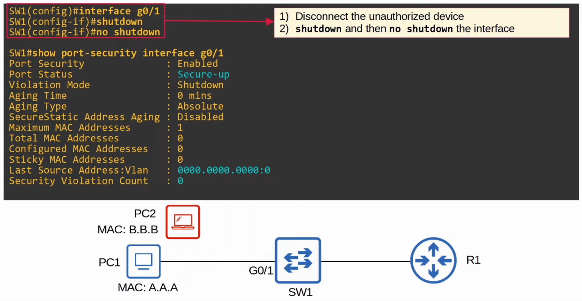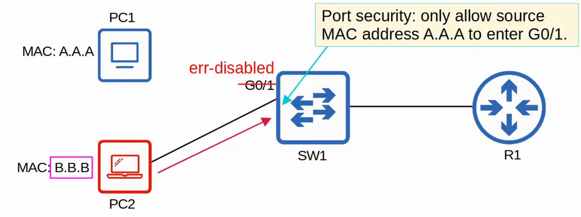 - If an unauthorized MAC address attempts to access the network, an action will be triggered. The default action is to place the interface in an “err-disabled” state, effectively shutting it down.