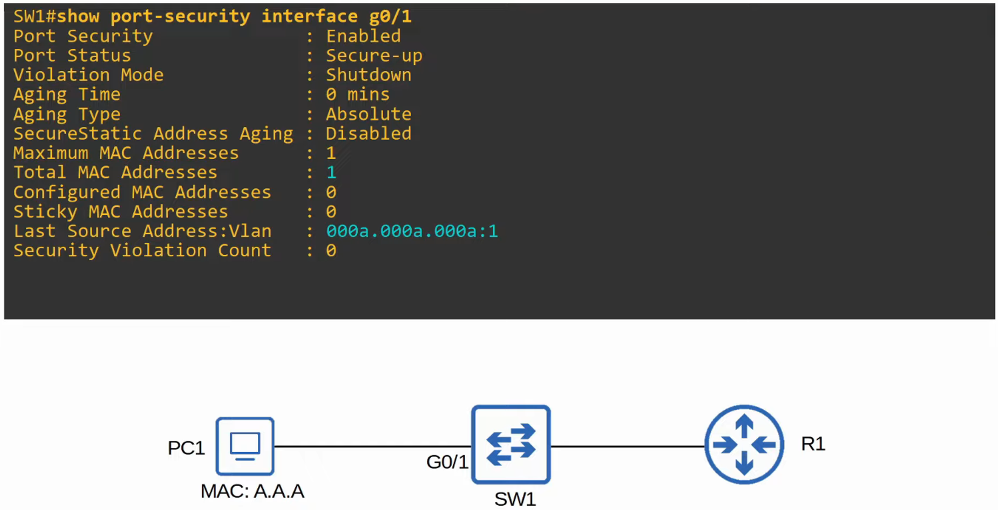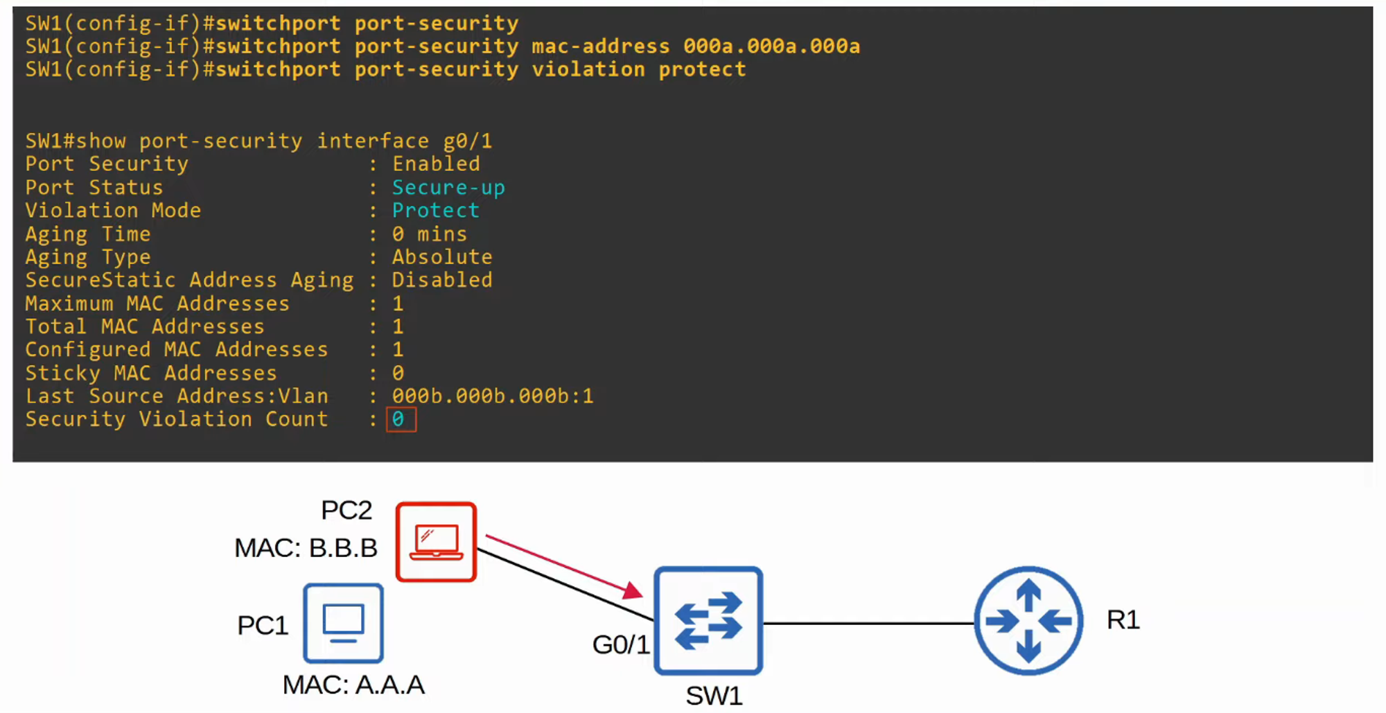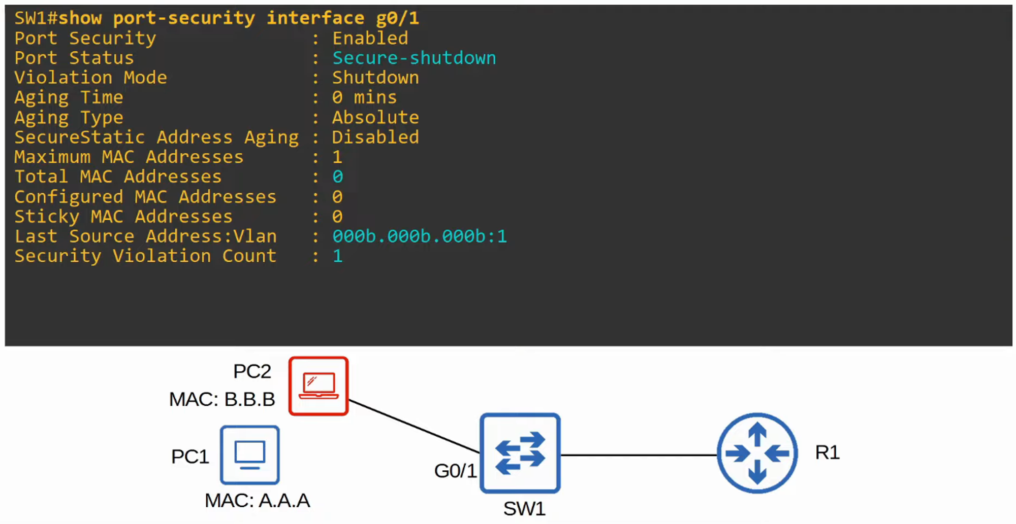 - If an unauthorized MAC address attempts to access the network, an action will be triggered. The default action is to place the interface in an “err-disabled” state, effectively shutting it down.