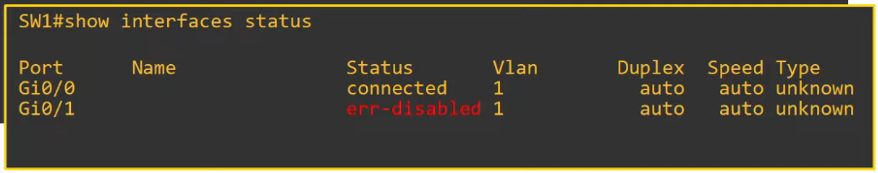 - The port is placed into an “err-disabled” state, effectively shutting it down.