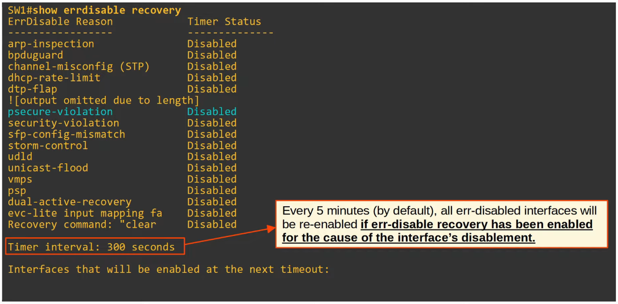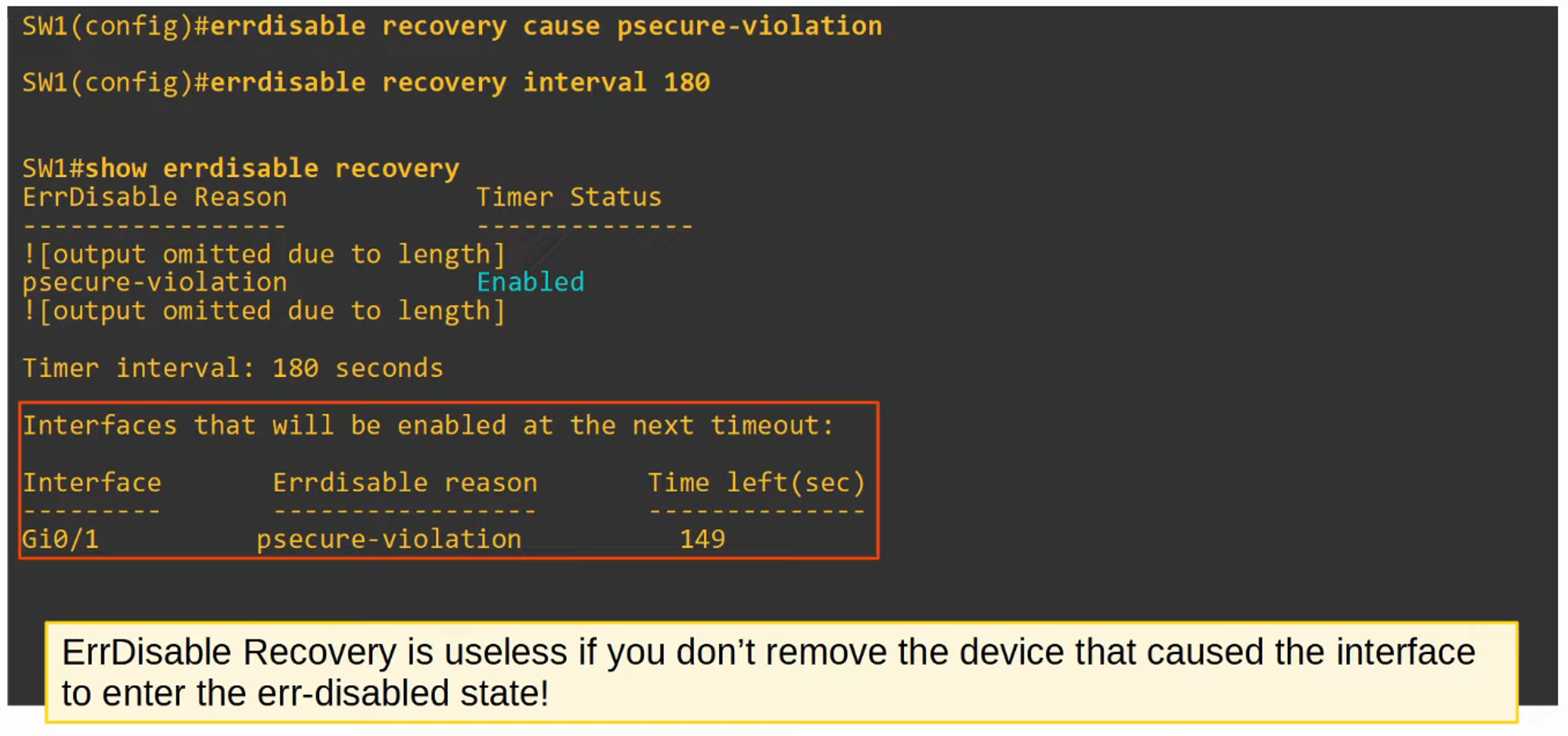 Alternatively, you can configure the switch to automatically recover from an “err-disabled” state after a certain time period.