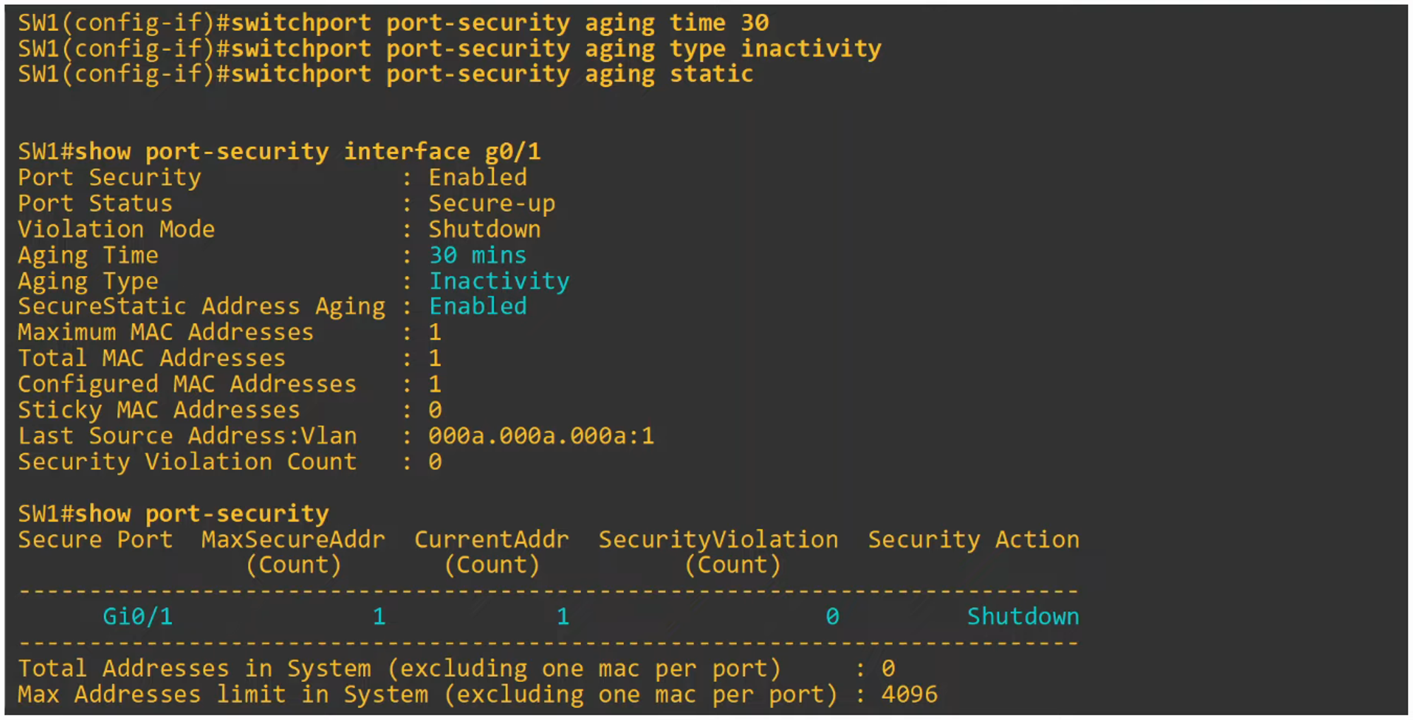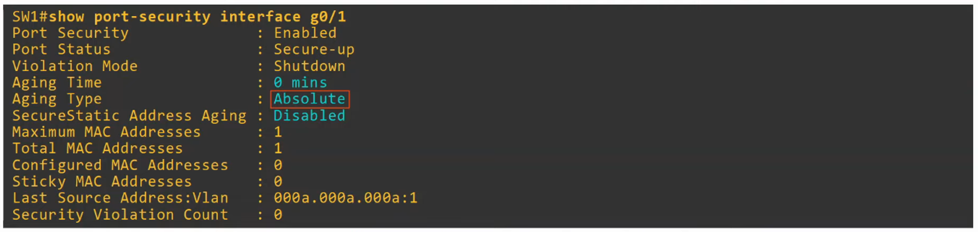 - The aging timer starts when the secure MAC address is learned, and the MAC address is removed once the timer expires, even if traffic from that MAC continues.