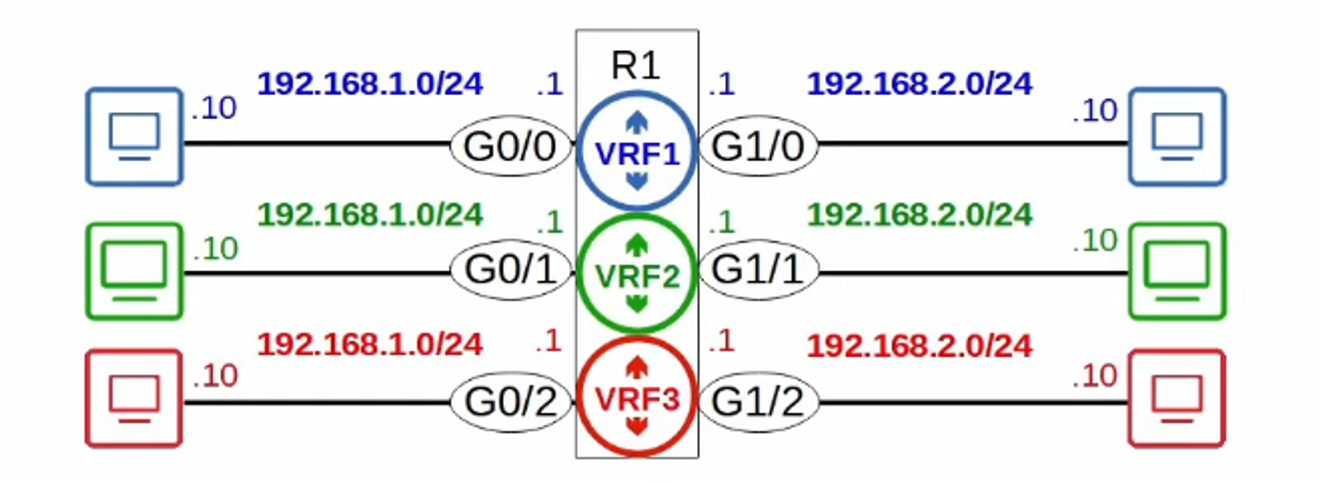 Virtual Routing and Forwarding (VRF) is a technology that enables a single physical router to function as multiple virtual routers, each with its own separate routing table. This concept is similar to how VLANs divide a physical switch into multiple virtual switches (VLANs).