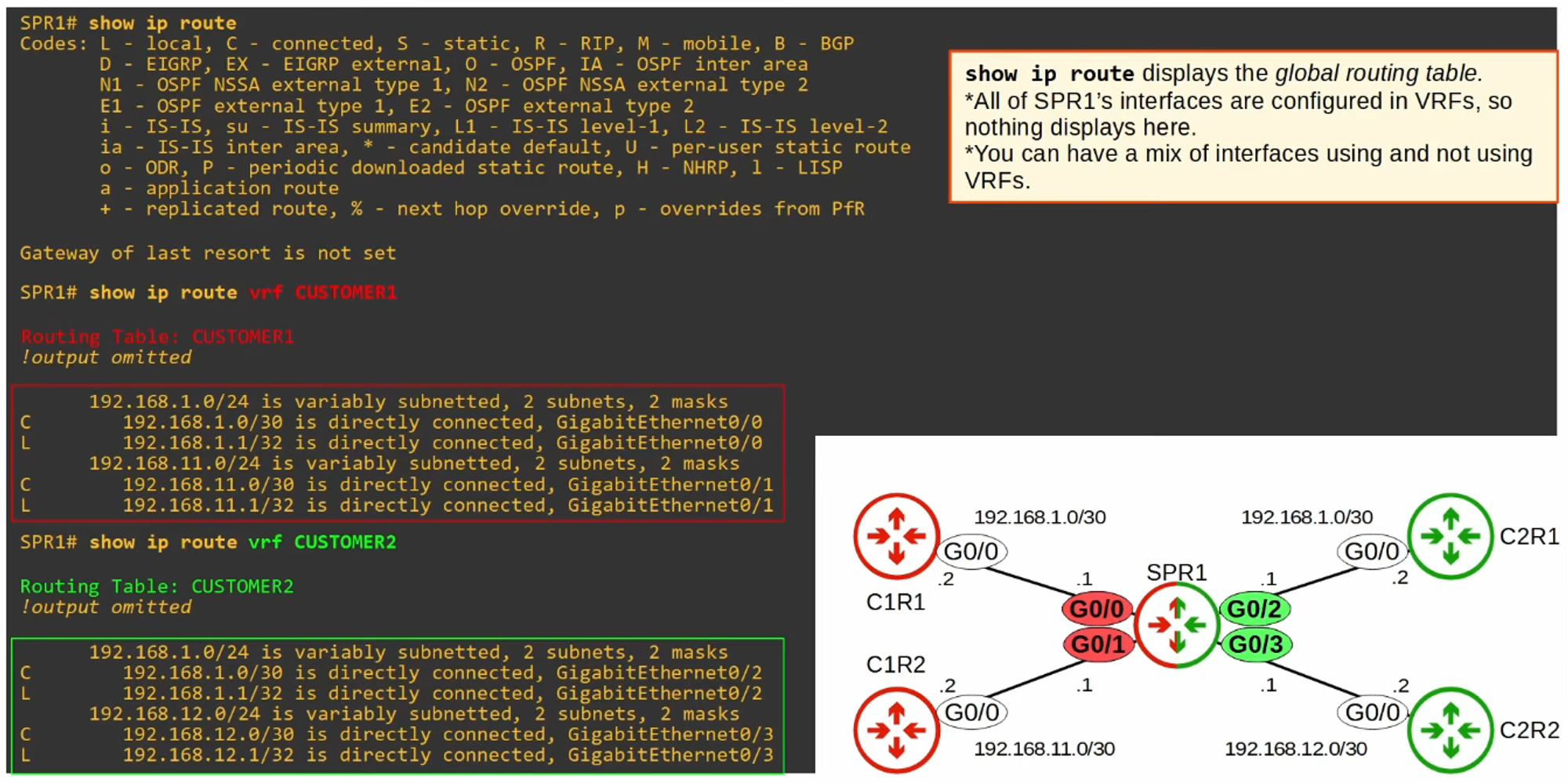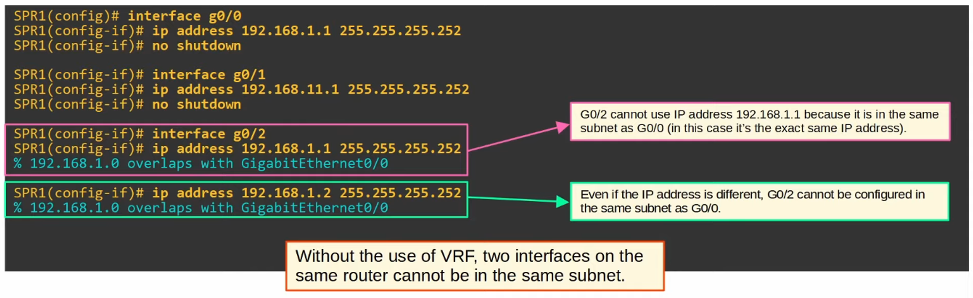 - Traffic Segmentation: Each VRF operates independently, meaning traffic from one VRF cannot be forwarded to an interface in another VRF. However, VRF leaking can be configured to allow controlled communication between VRFs.