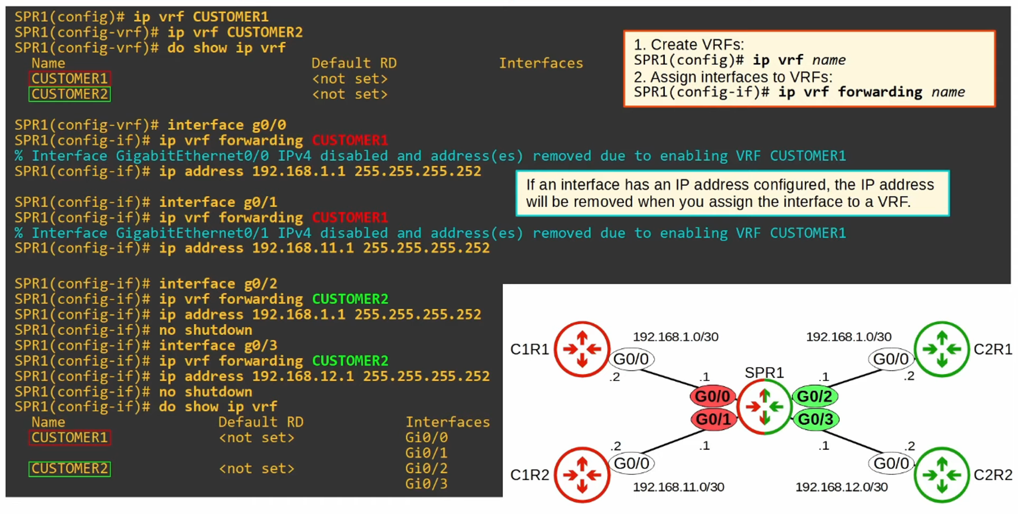 - MPLS (Multiprotocol Label Switching): VRF is widely used in MPLS networks to manage traffic for different customers on the same infrastructure. The version discussed here, VRF-Lite, operates without MPLS, simplifying its application in non-MPLS environments.