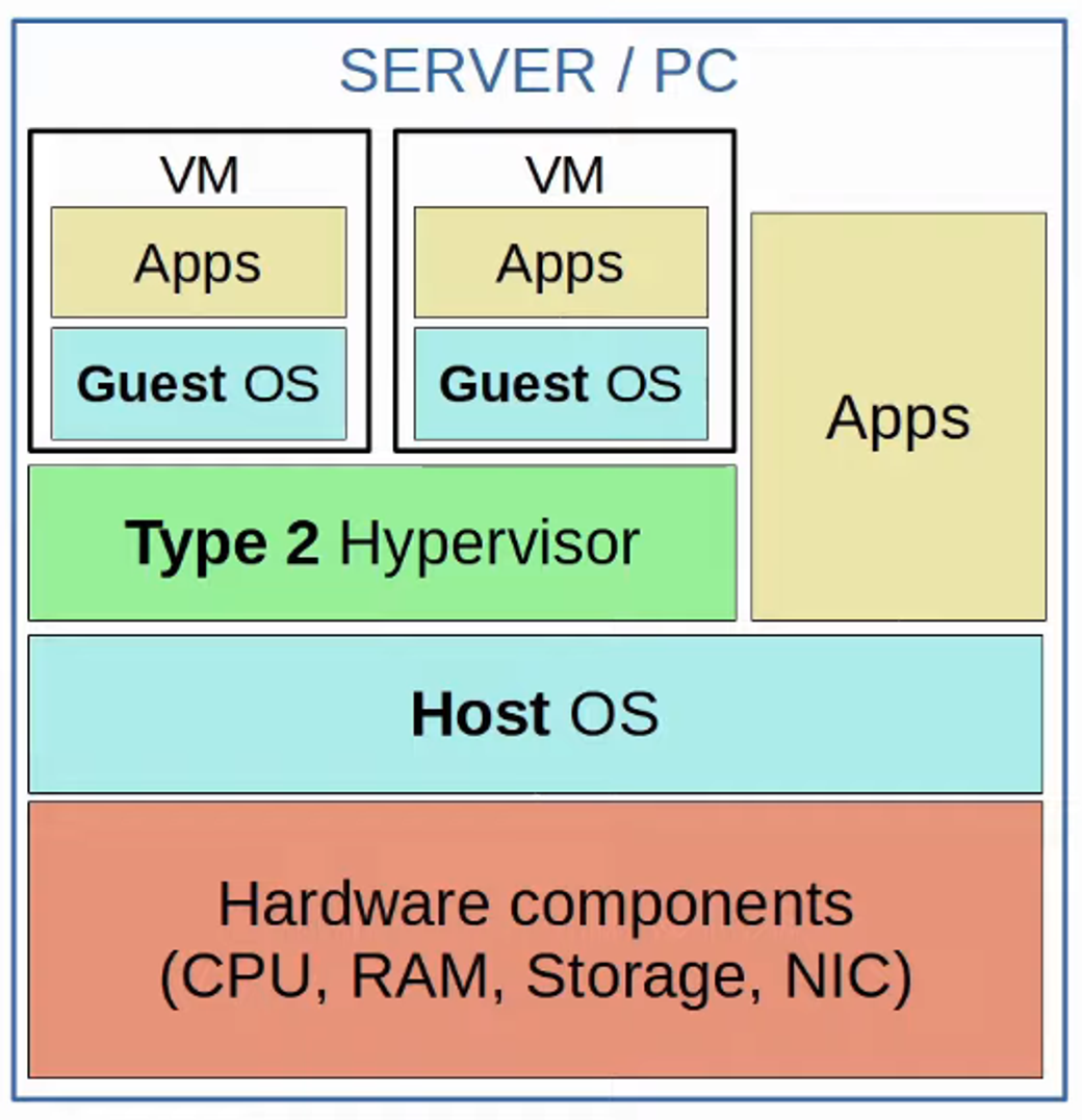 - A Hypervisor manages the allocation of hardware resources (e.g., CPU, RAM) among VMs.